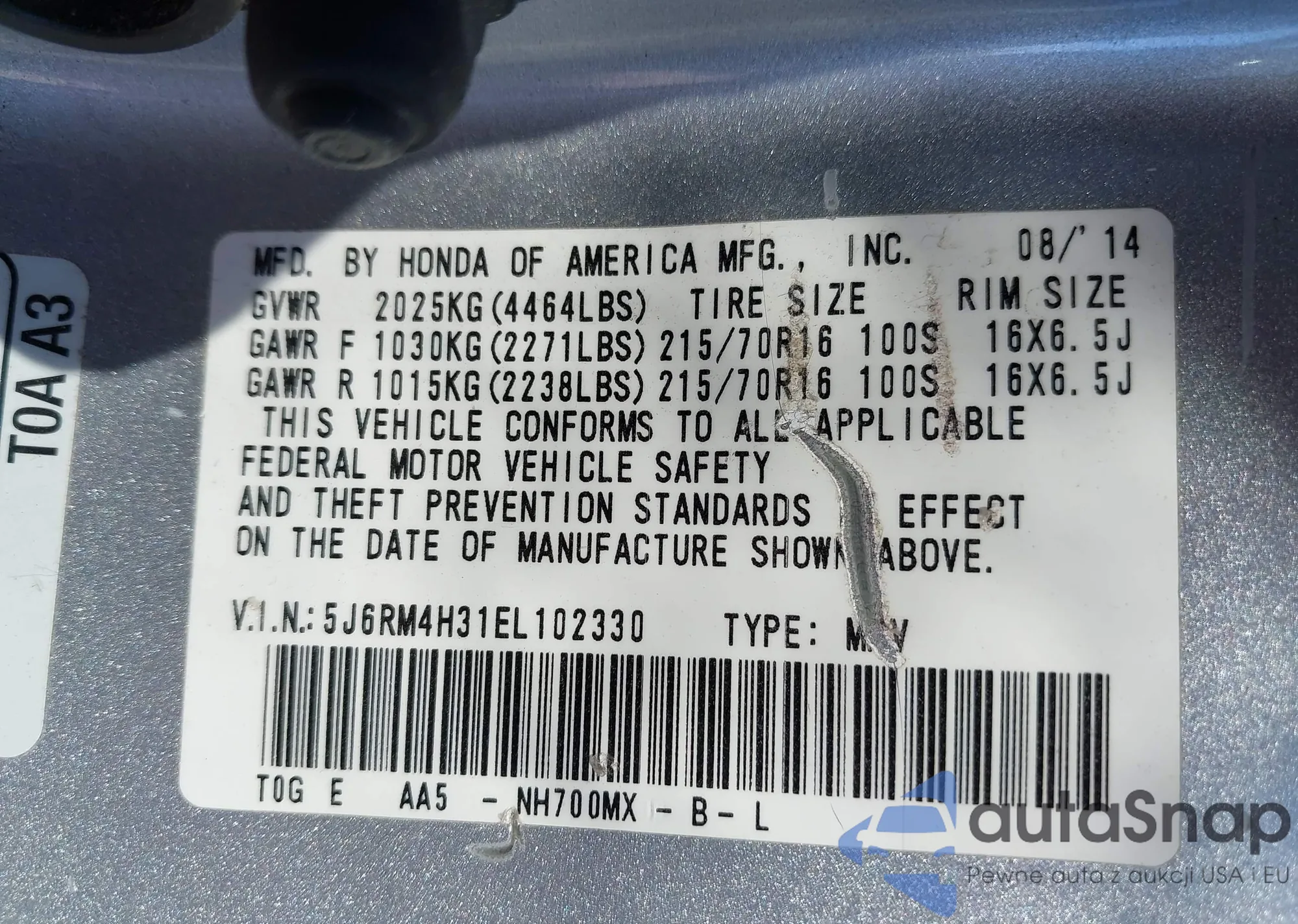 VIN: 5J6RM4H31EL102330
