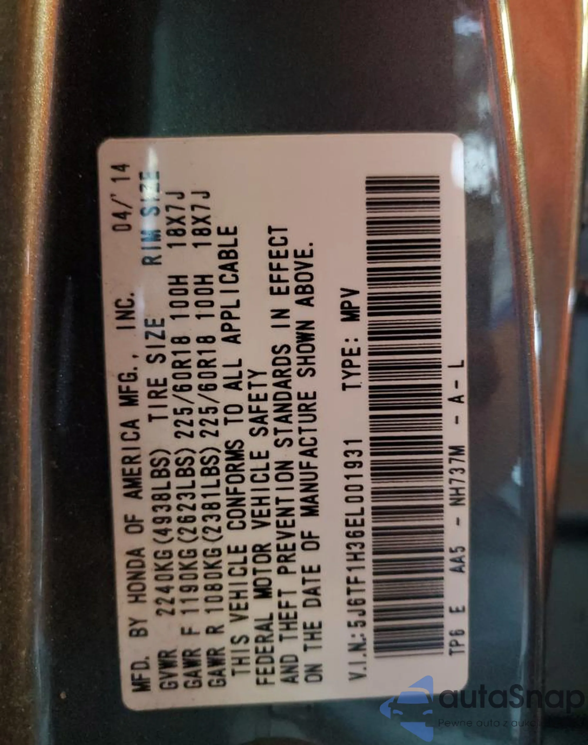 Автомобиль Honda Crosstour 2014 (VIN 5J6TF1H36EL001931) имеет документы, препятствующие регистрации. Могут возникнуть сложности при экспорте и регистрации. Обратитесь к экспертам AutaSnap для поиска альтернатив.