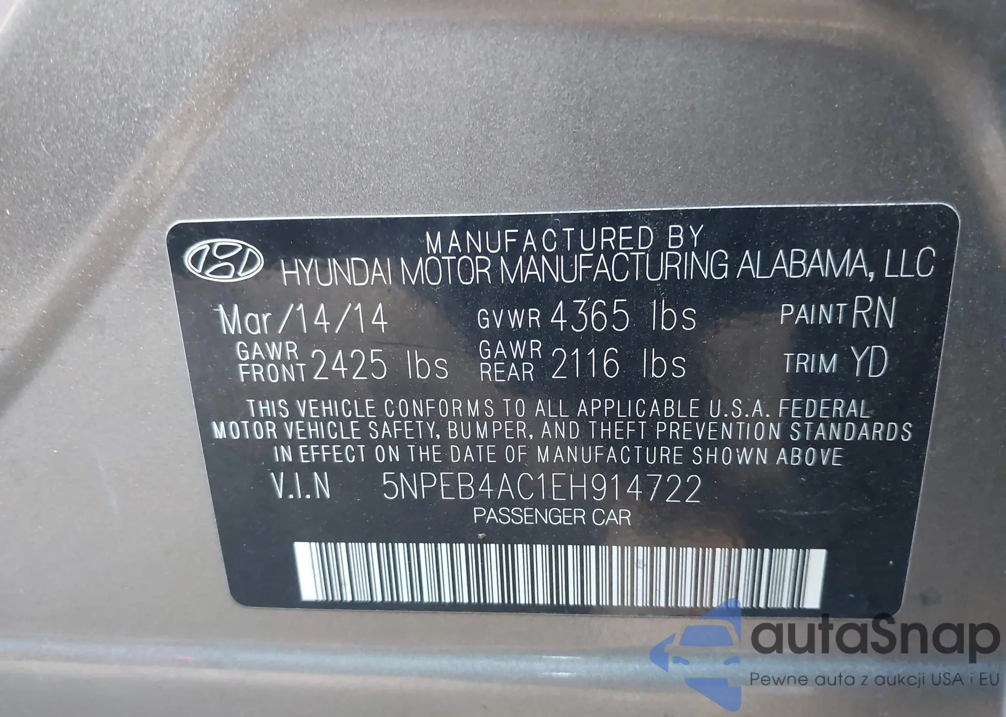 VIN: 5NPEB4AC1EH914722