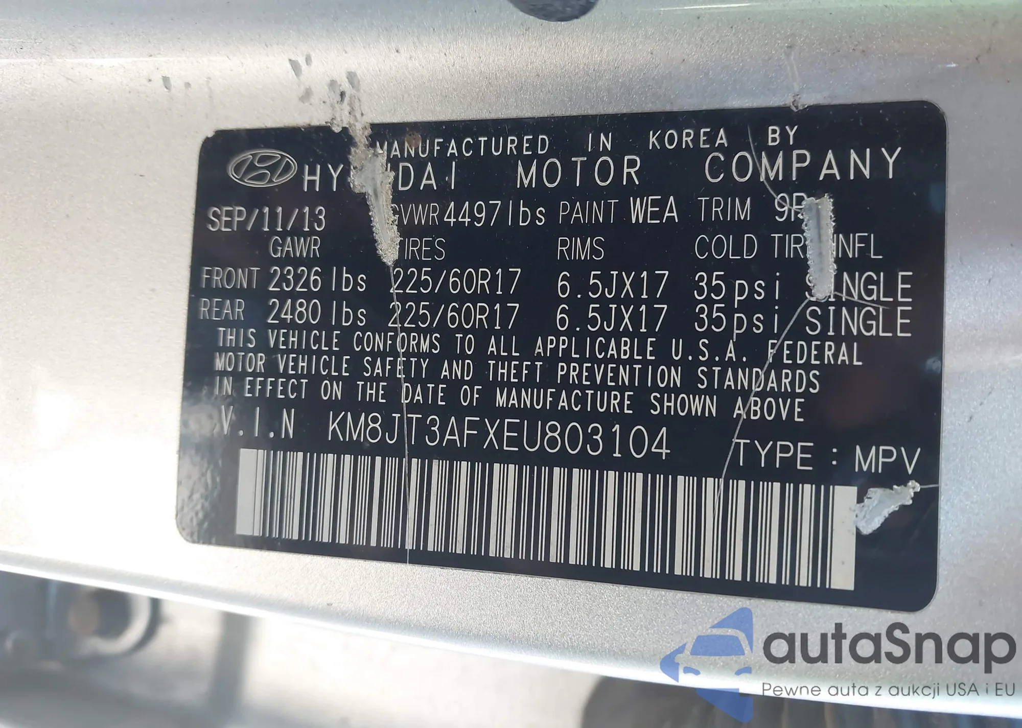 • VIN: KM8JT3AFXEU803104