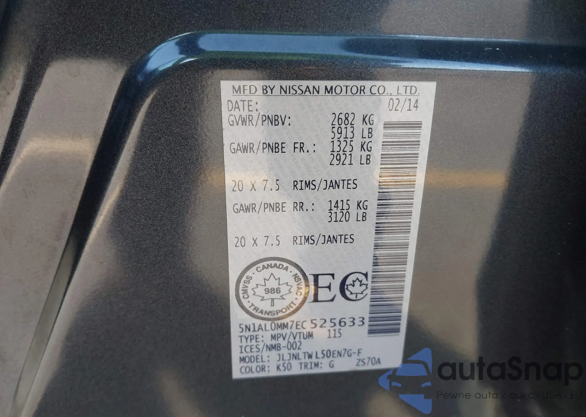 • VIN: 5N1AL0MM7EC525633