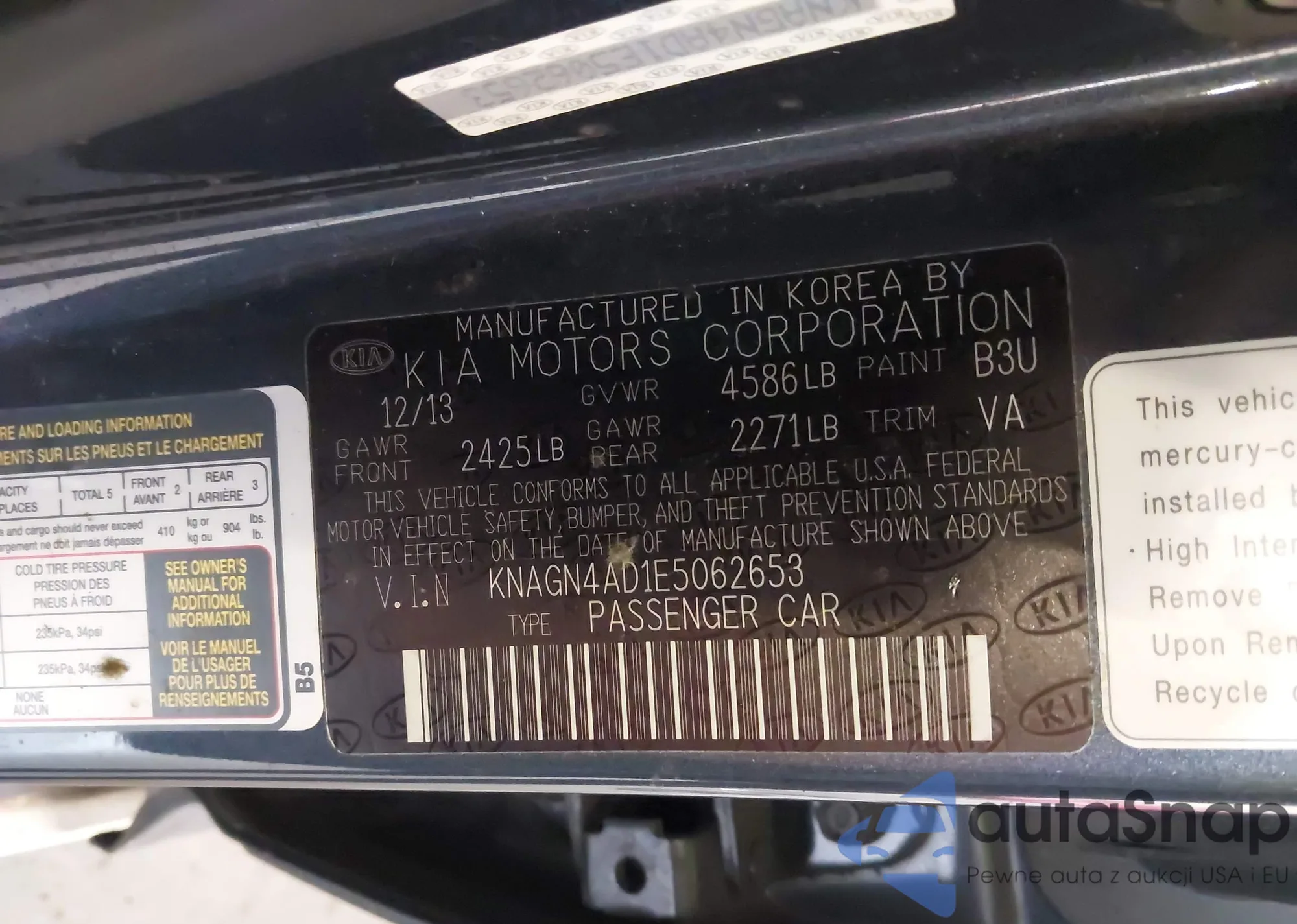 Автомобиль Kia Optima 2014 (VIN KNAGN4AD1E5062653) ранее не участвовал в торгах. Документы чистые, пробег соответствует или ниже среднего по рынку. Продаётся страховой компанией — рекомендуем покупку. Доставка в порт займет около 6–8 недель.