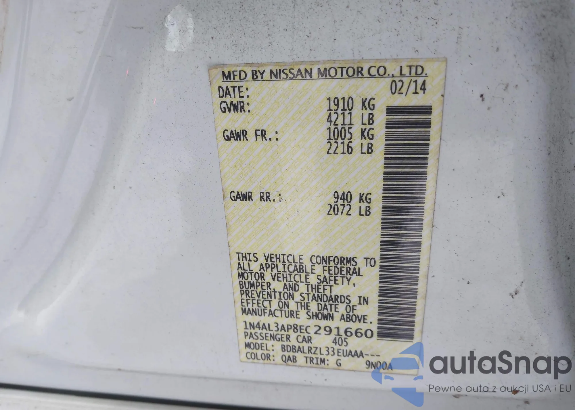 VIN: 1N4AL3AP8EC291660