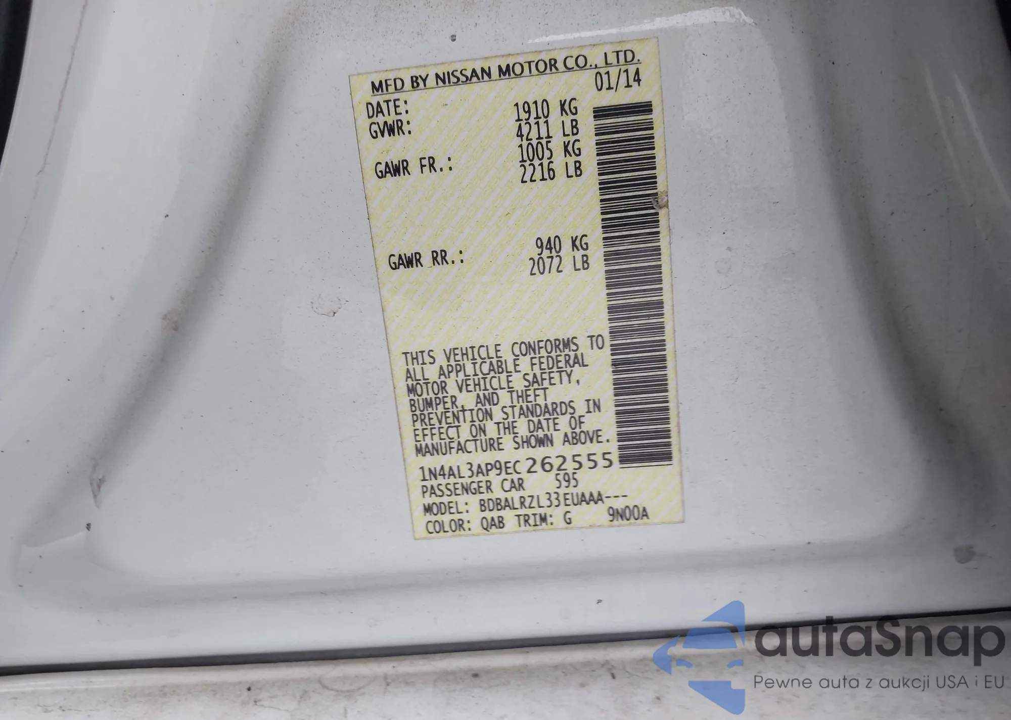 Автомобиль Nissan Altima 2014 (VIN 1N4AL3AP9EC262555) ранее не участвовал в торгах. Документы чистые, пробег соответствует или ниже среднего по рынку. Продаётся страховой компанией — рекомендуем покупку. Доставка в порт займет около 6–8 недель.