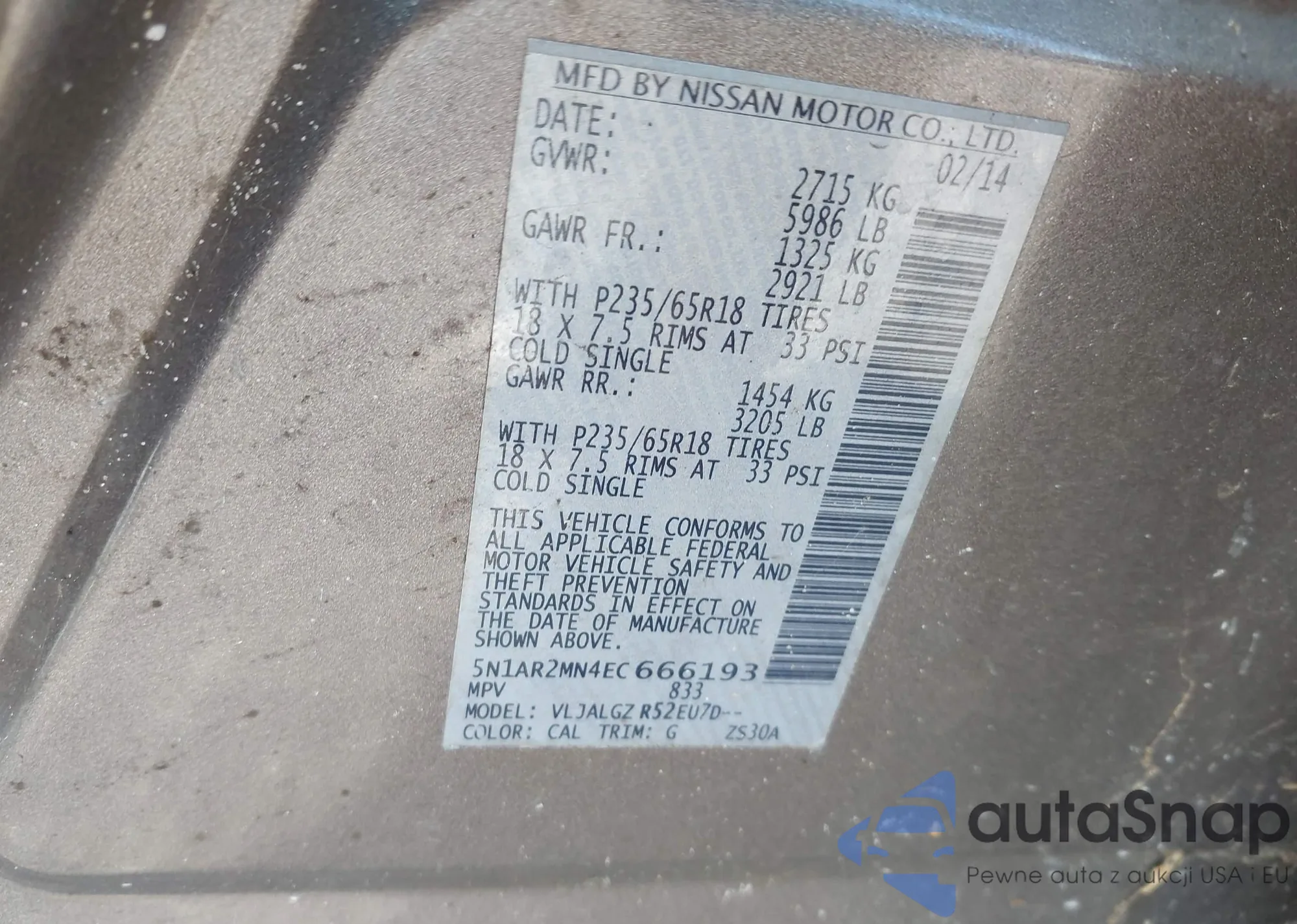 VIN: 5N1AR2MN4EC666193