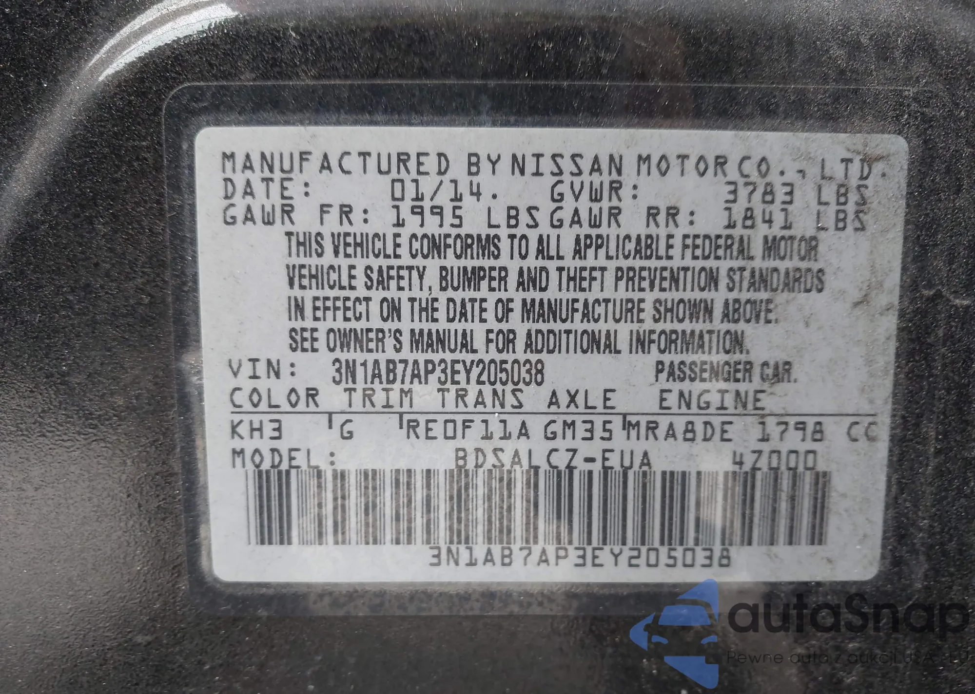 VIN: 3N1AB7AP3EY205038