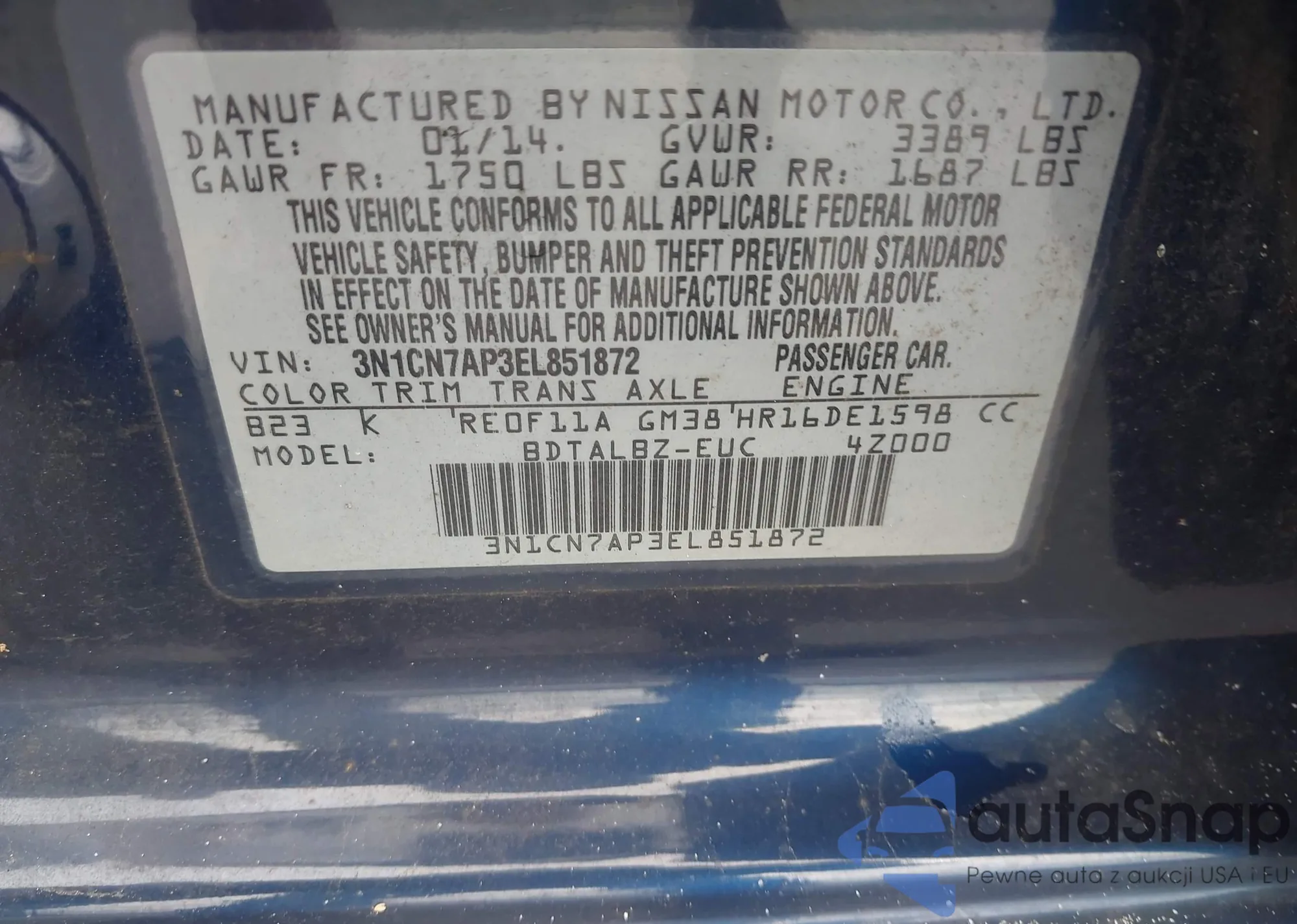 VIN: 3N1CN7AP3EL851872