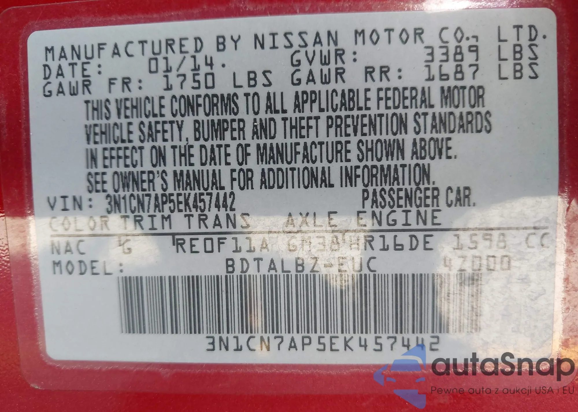 VIN: 3N1CN7AP5EK457442