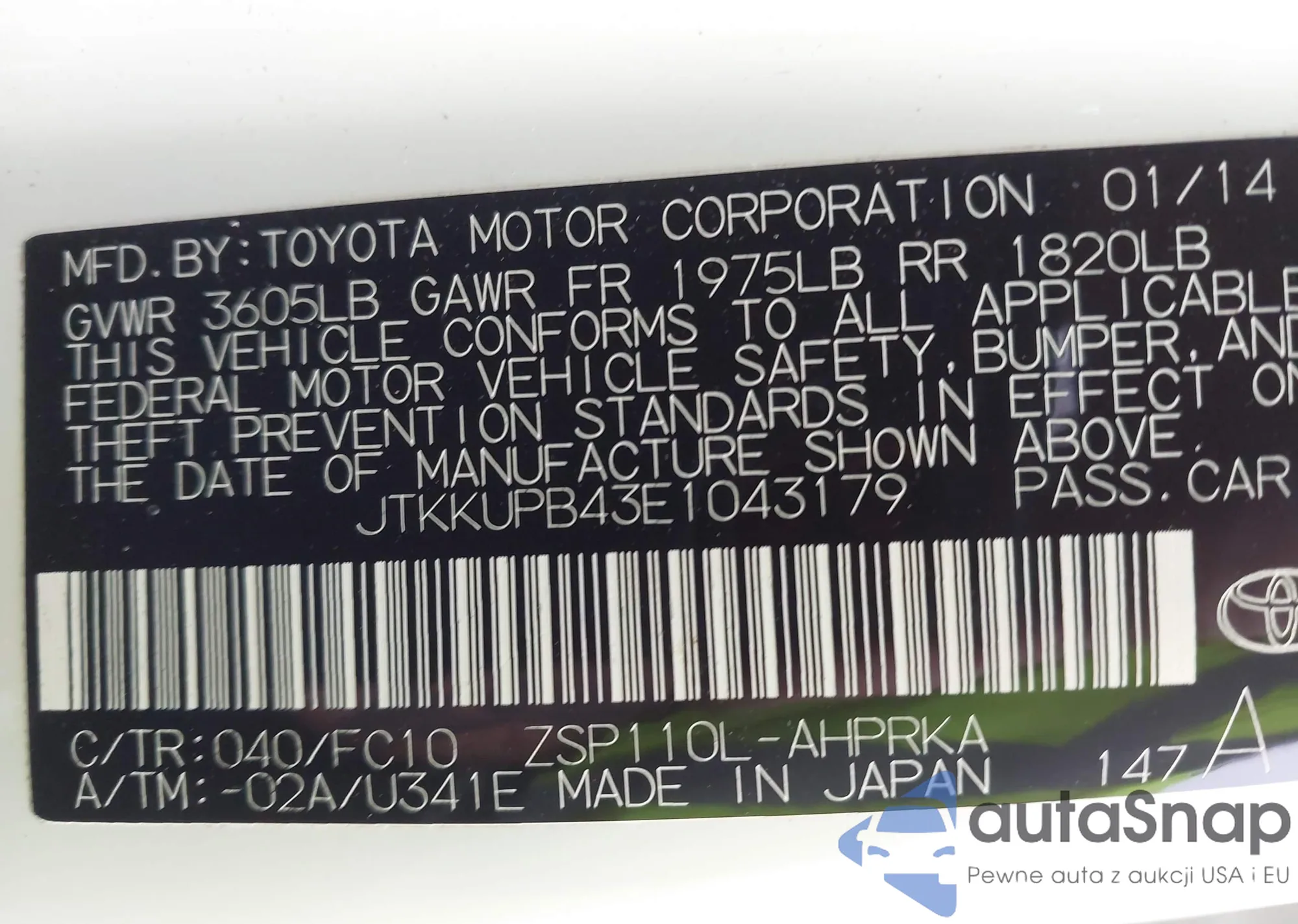 • VIN: JTKKUPB43E1043179