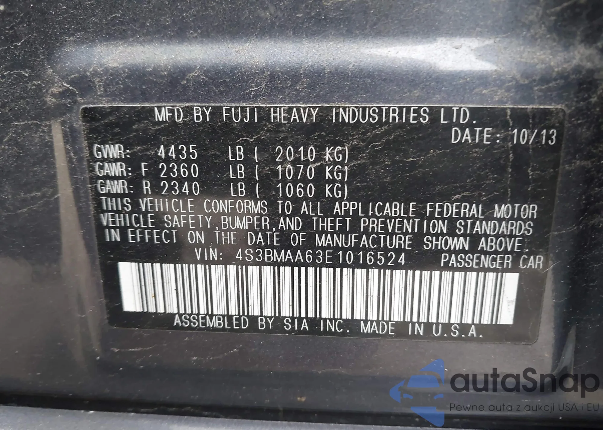 Автомобиль Subaru Legacy 2014 (VIN 4S3BMAA63E1016524) ранее не участвовал в торгах. Документы чистые, пробег соответствует или ниже среднего по рынку. Продаётся страховой компанией — рекомендуем покупку. Доставка в порт займет около 6–8 недель.