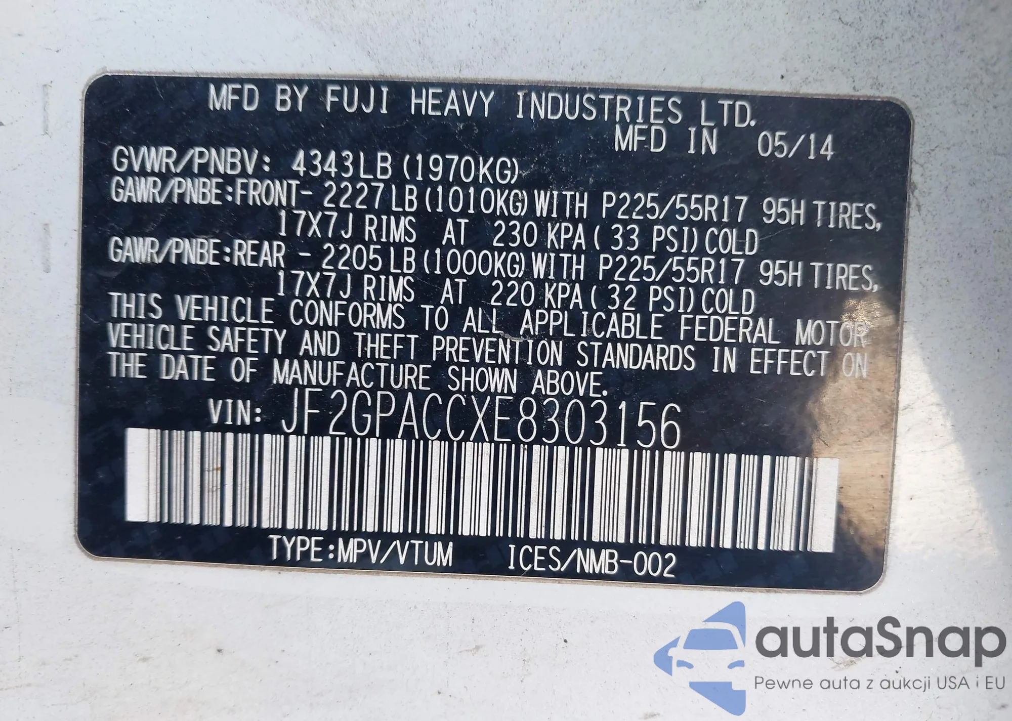 Автомобиль Subaru XV 2014 (VIN JF2GPACCXE8303156) ранее не участвовал в торгах. Документы чистые, пробег соответствует или ниже среднего по рынку. Продаётся страховой компанией — рекомендуем покупку. Доставка в порт займет около 6–8 недель.