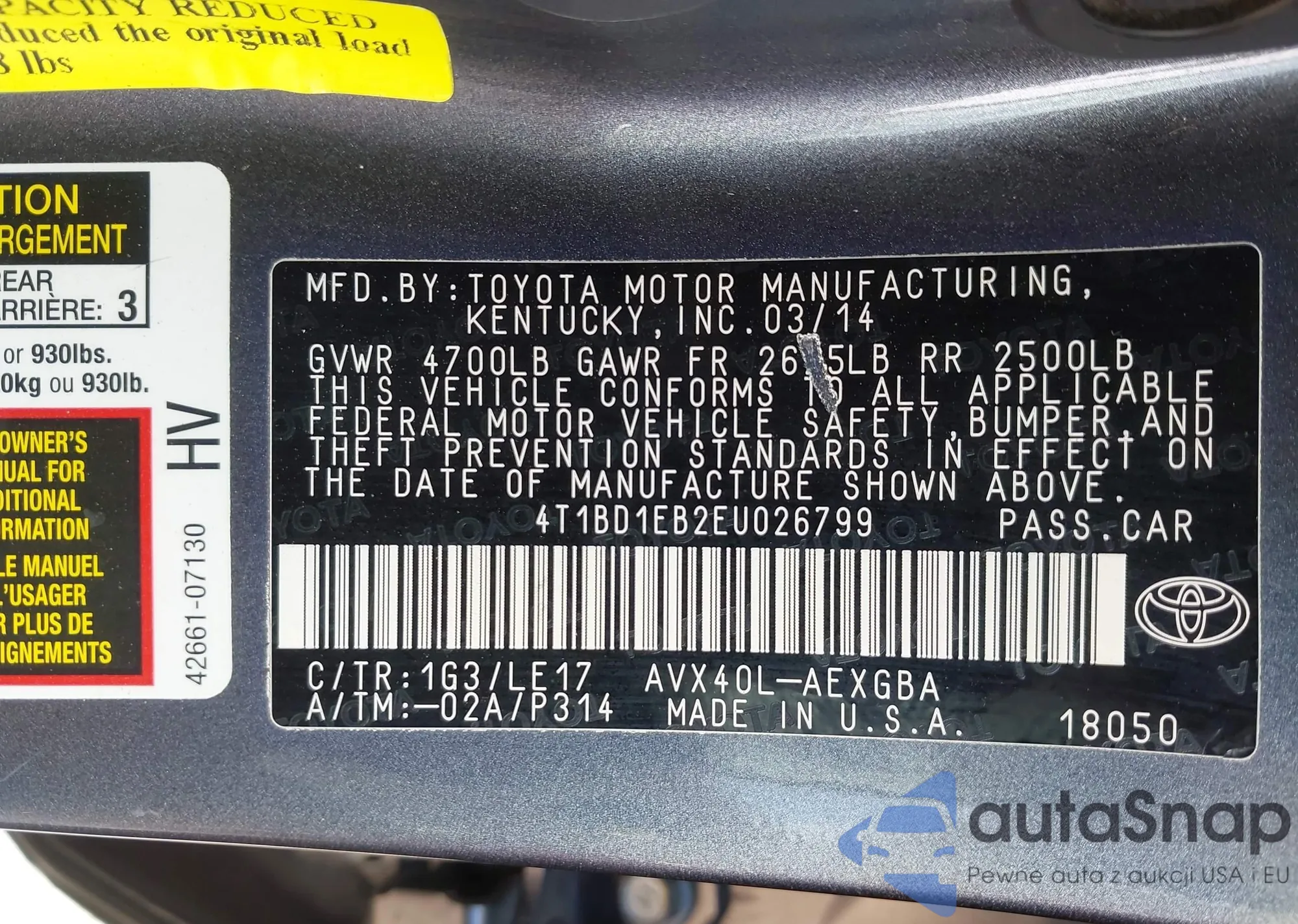 • VIN: 4T1BD1EB2EU026799