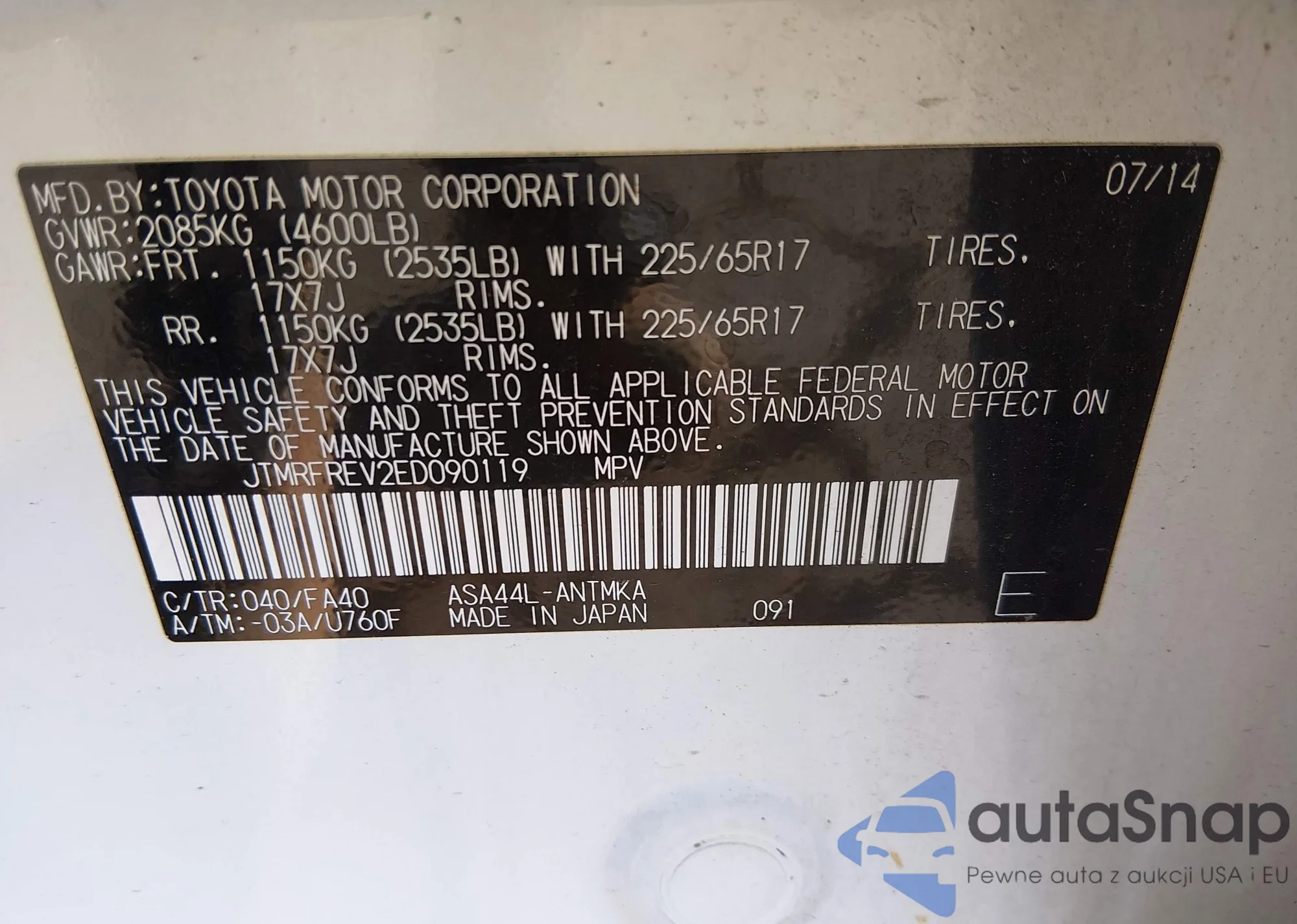 Автомобиль Toyota RAV 4 2014 (VIN JTMRFREV2ED090119) ранее не участвовал в торгах. Документы чистые, пробег соответствует или ниже среднего по рынку. Продаётся страховой компанией — рекомендуем покупку. Доставка в порт займет около 6–8 недель.