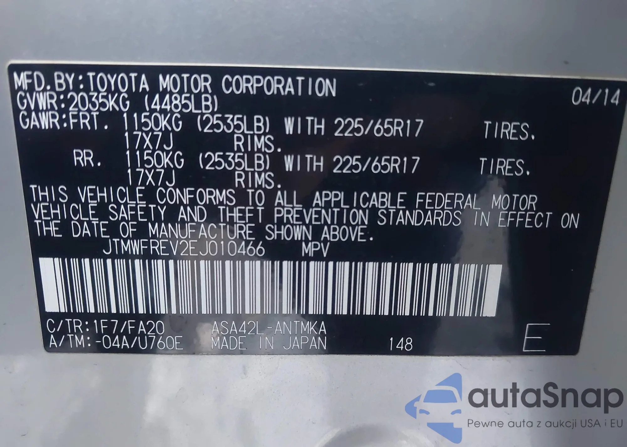 Автомобиль Toyota RAV 4 2014 (VIN JTMWFREV2EJ010466) ранее не участвовал в торгах. Документы чистые, пробег соответствует или ниже среднего по рынку. Продаётся страховой компанией — рекомендуем покупку. Доставка в порт займет около 6–8 недель.