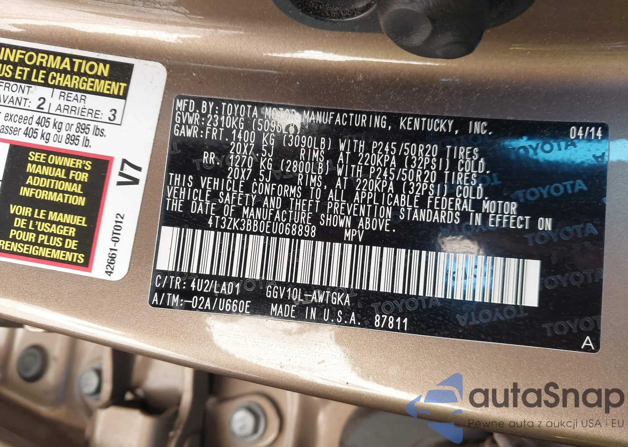 VIN: 4T3ZK3BB0EU068898