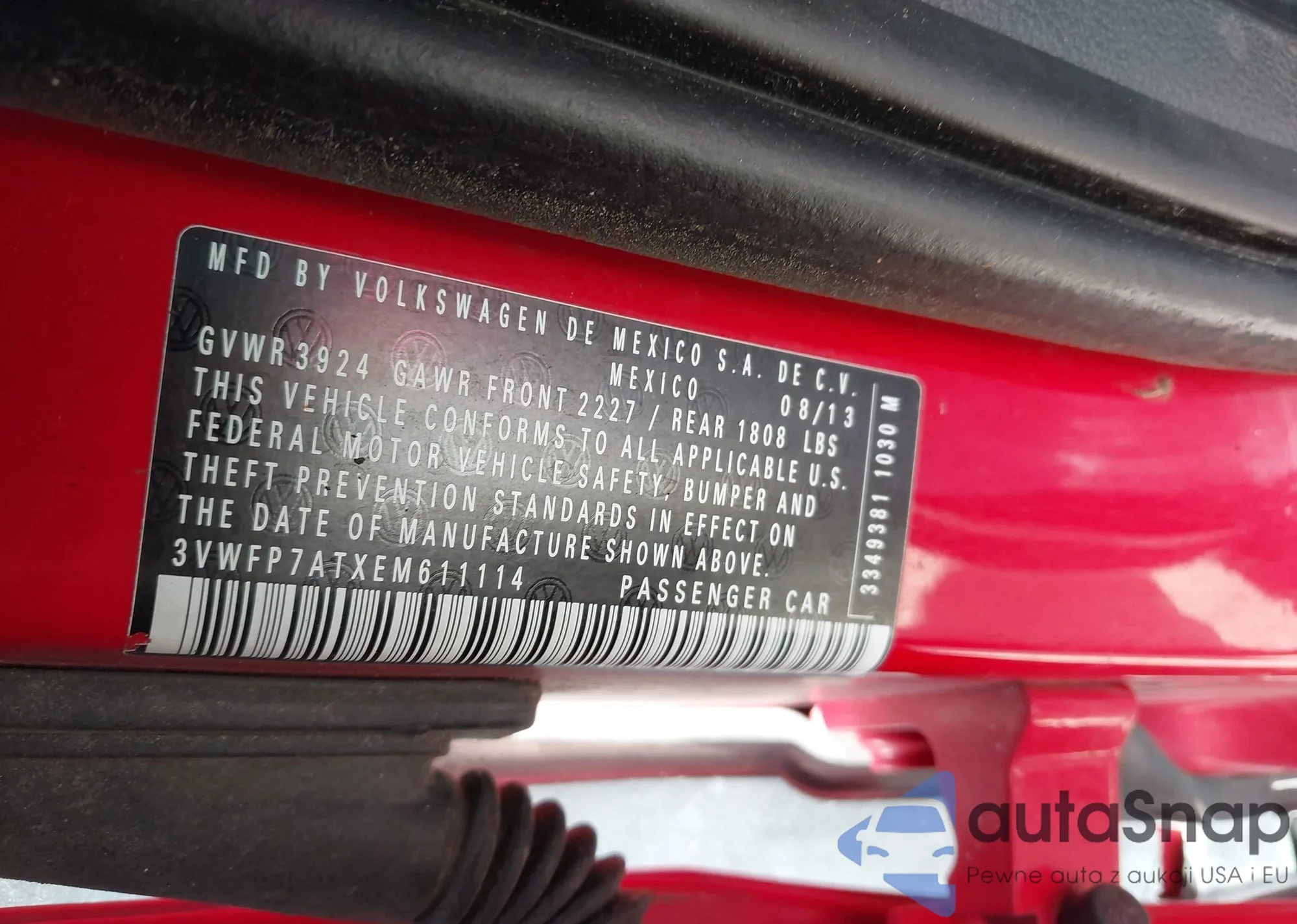 Автомобиль Volkswagen Beetle 2014 (VIN 3VWFP7ATXEM611114) имеет документы, препятствующие регистрации. Могут возникнуть сложности при экспорте и регистрации. Обратитесь к экспертам AutaSnap для поиска альтернатив.