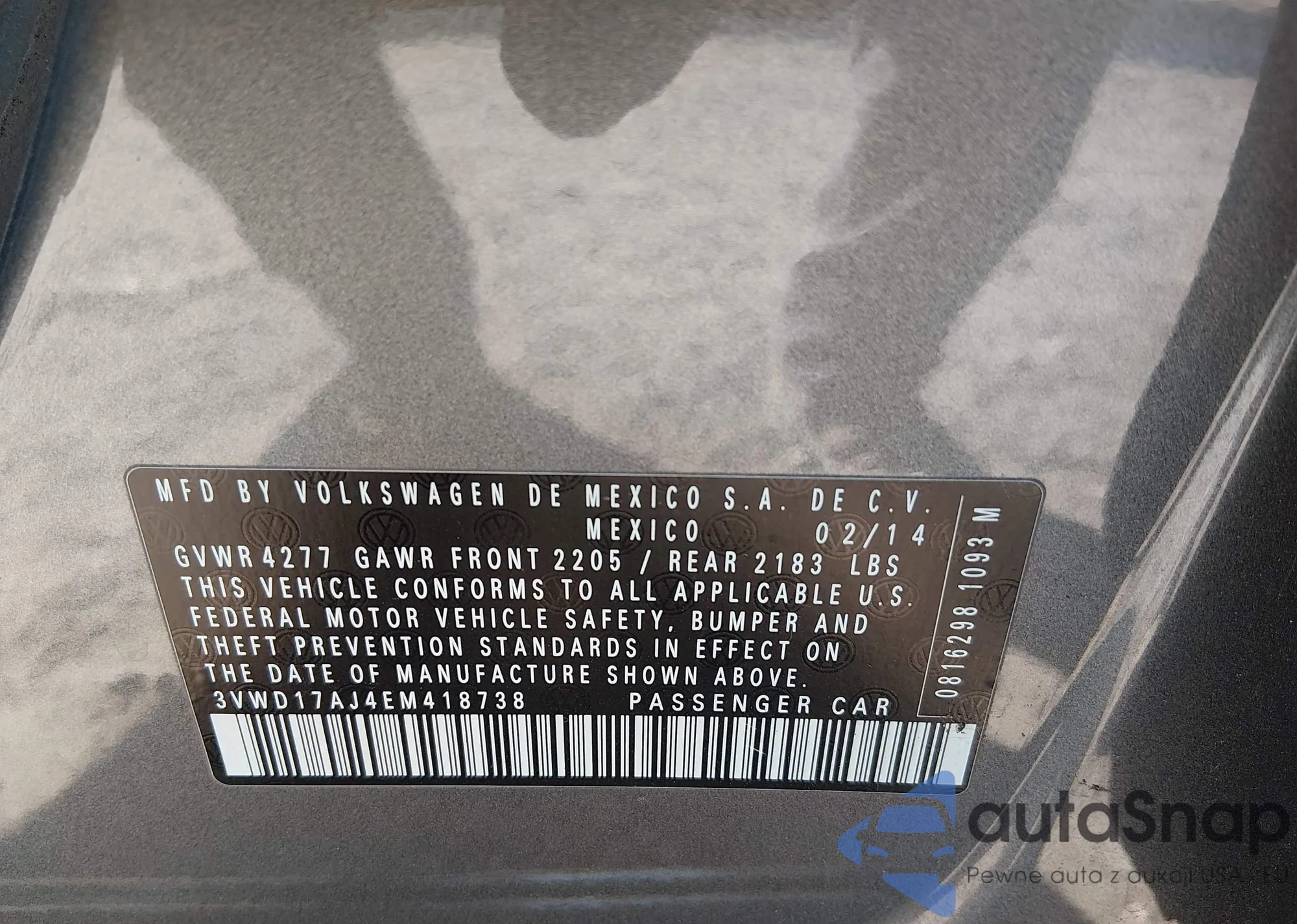 Автомобиль Volkswagen Jetta 2014 (VIN 3VWD17AJ4EM418738) ранее не участвовал в торгах. Документы чистые, пробег соответствует или ниже среднего по рынку. Продаётся страховой компанией — рекомендуем покупку. Доставка в порт займет около 6–8 недель.