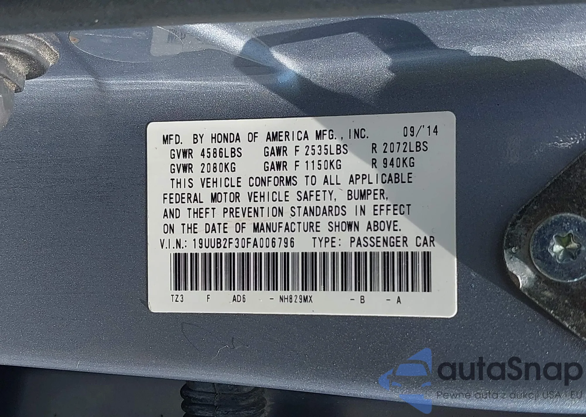 • VIN: 19UUB2F30FA006796
