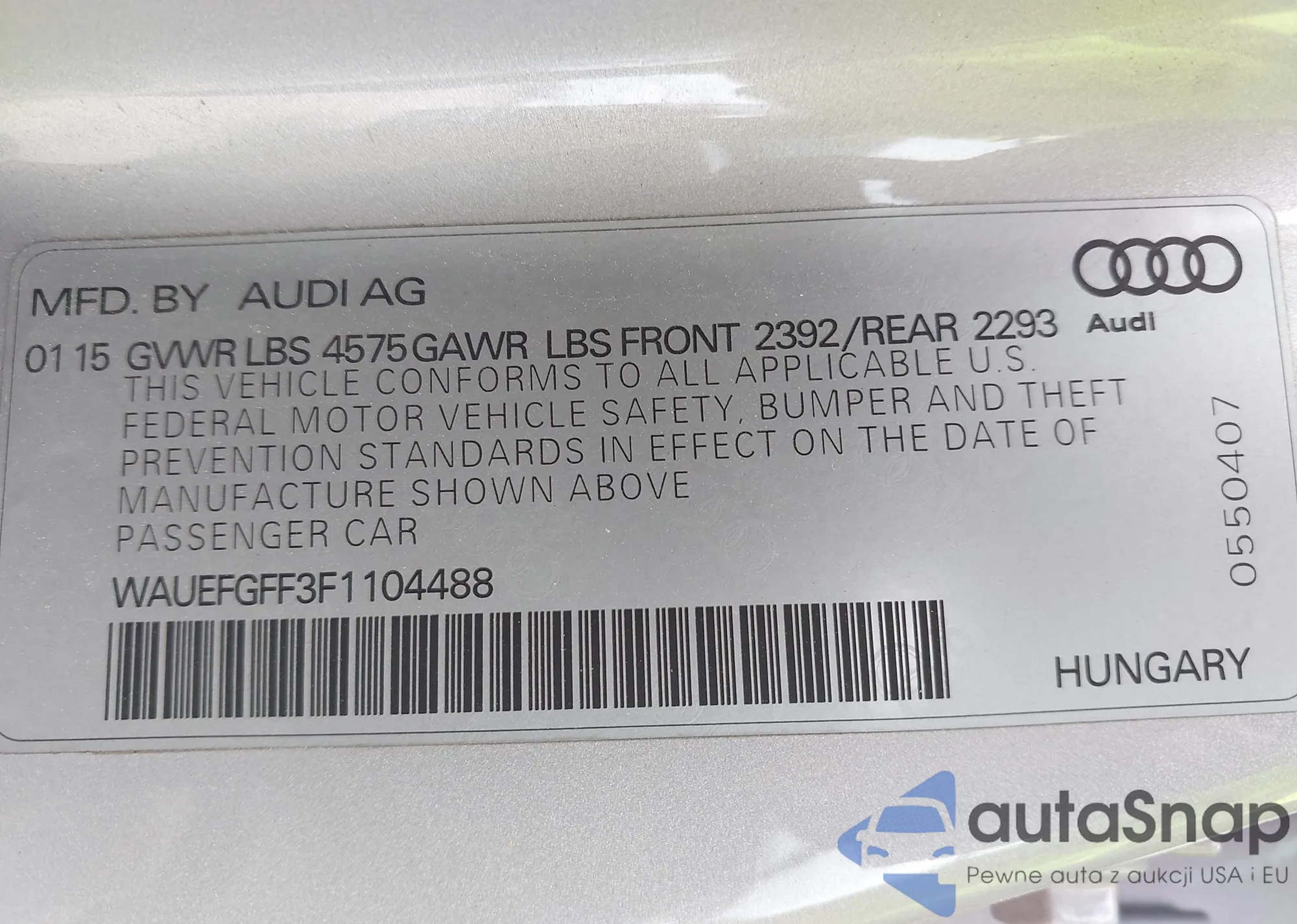 Автомобиль Audi A3 2015 (VIN WAUEFGFF3F1104488) ранее не участвовал в торгах. Документы чистые, пробег соответствует или ниже среднего по рынку. Продаётся страховой компанией — рекомендуем покупку. Доставка в порт займет около 6–8 недель.