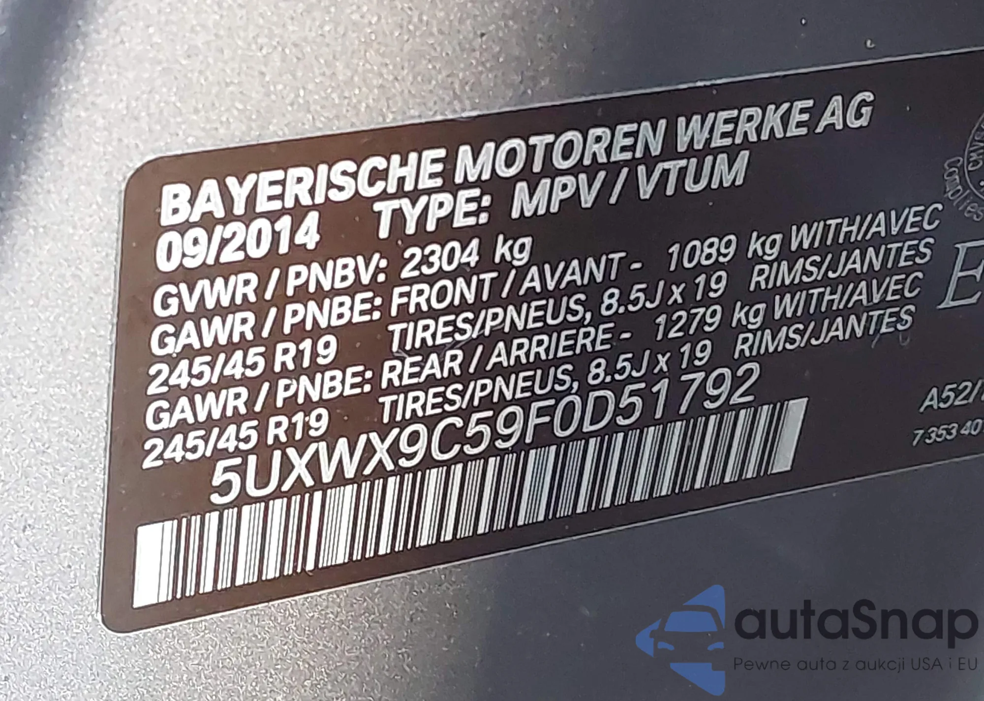 Автомобиль BMW X3 2015 (VIN 5UXWX9C59F0D51792) имеет документы, препятствующие регистрации. Могут возникнуть сложности при экспорте и регистрации. Обратитесь к экспертам AutaSnap для поиска альтернатив.