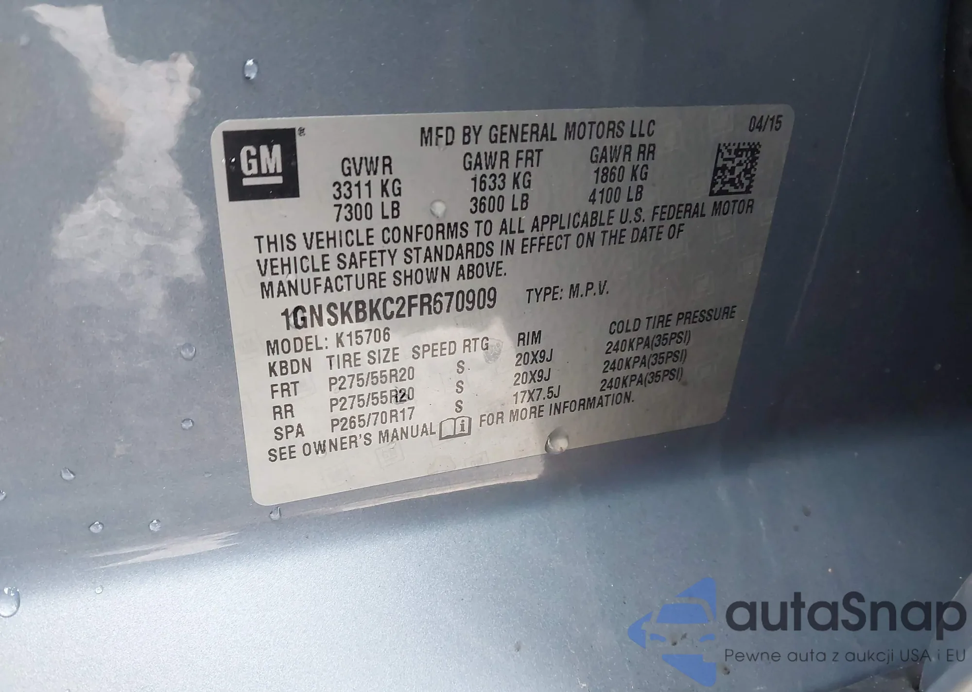 Автомобиль Chevrolet Tahoe 2015 (VIN 1GNSKBKC2FR670909) ранее не участвовал в торгах. Документы чистые, пробег соответствует или ниже среднего по рынку. Продаётся страховой компанией — рекомендуем покупку. Доставка в порт займет около 6–8 недель.