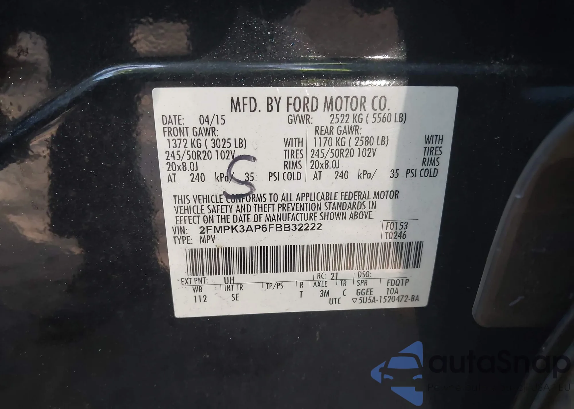 VIN: 2FMPK3AP6FBB32222