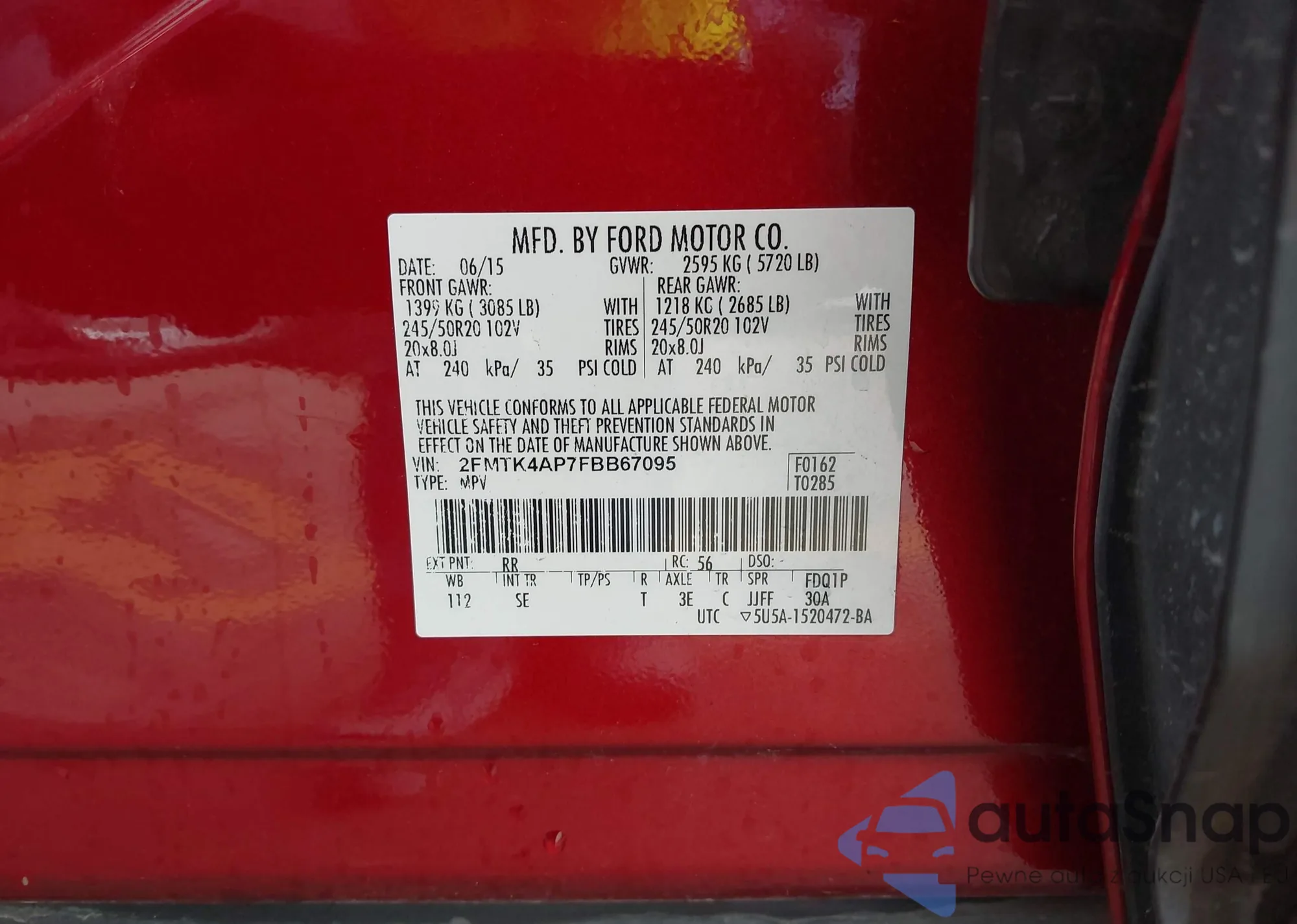 Автомобиль Ford Edge 2015 (VIN 2FMTK4AP7FBB67095) ранее не участвовал в торгах. Документы чистые, пробег соответствует или ниже среднего по рынку. Продаётся страховой компанией — рекомендуем покупку. Доставка в порт займет около 6–8 недель.