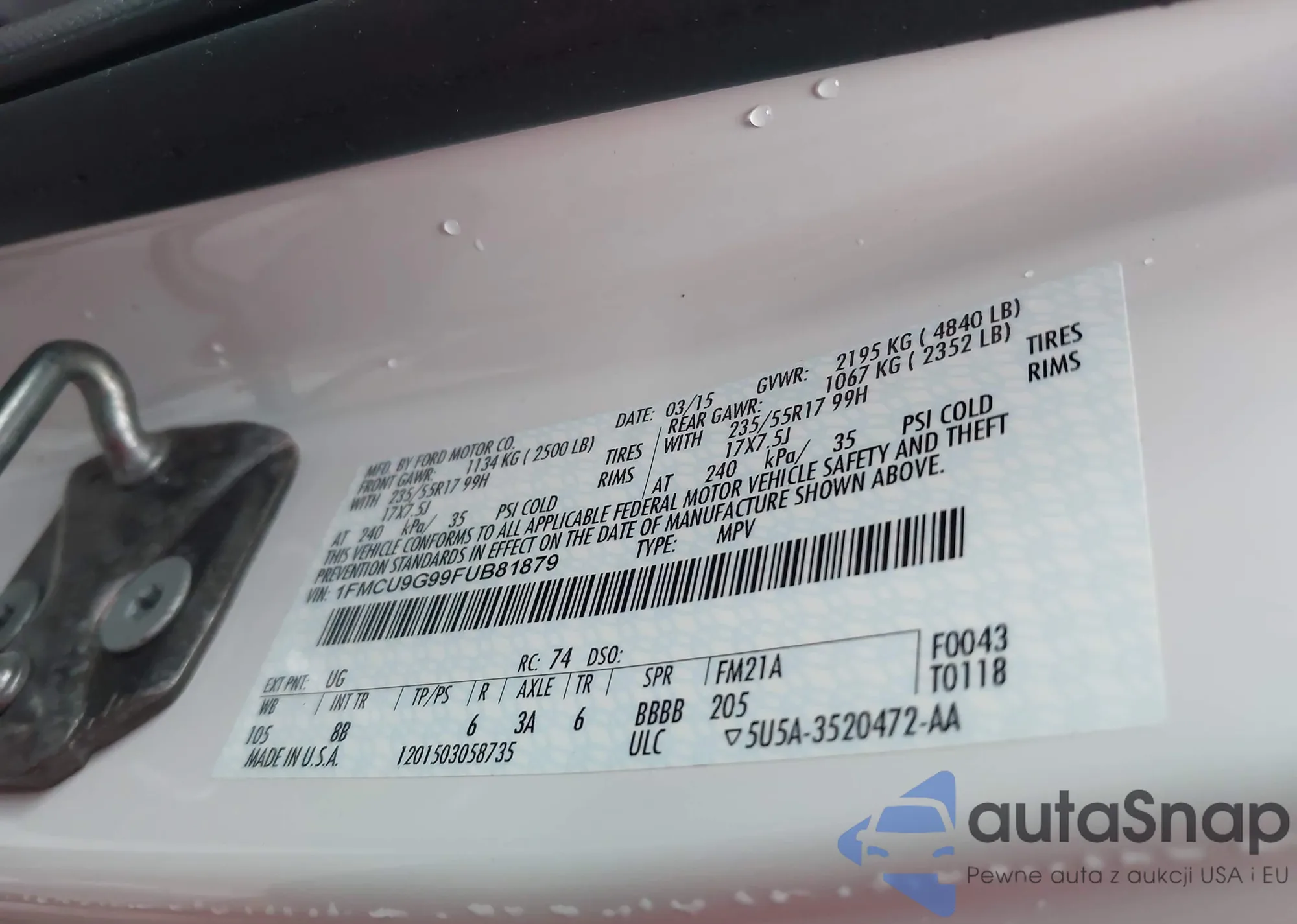 • VIN: 1FMCU9G99FUB81879