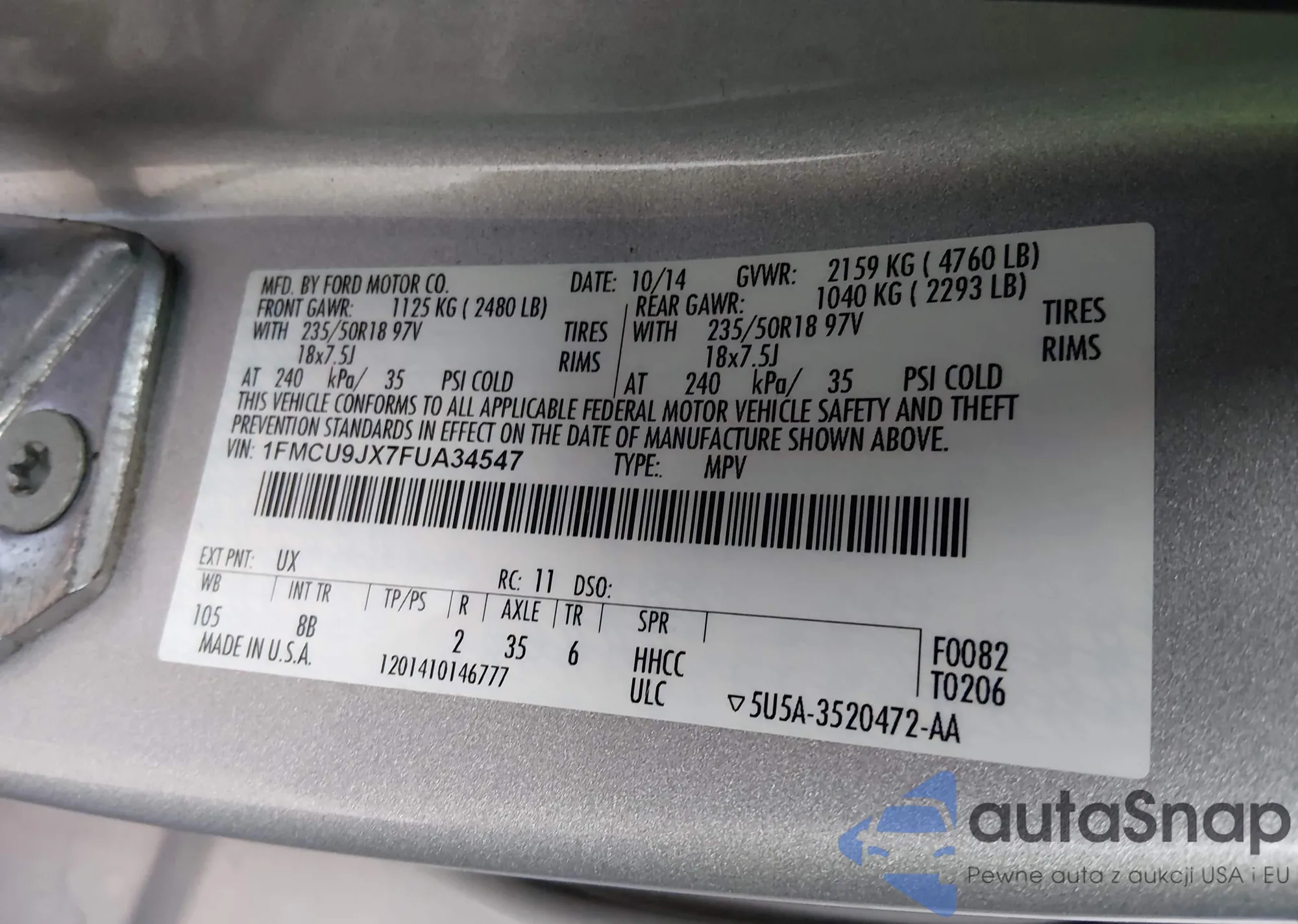 VIN: 1FMCU9JX7FUA34547