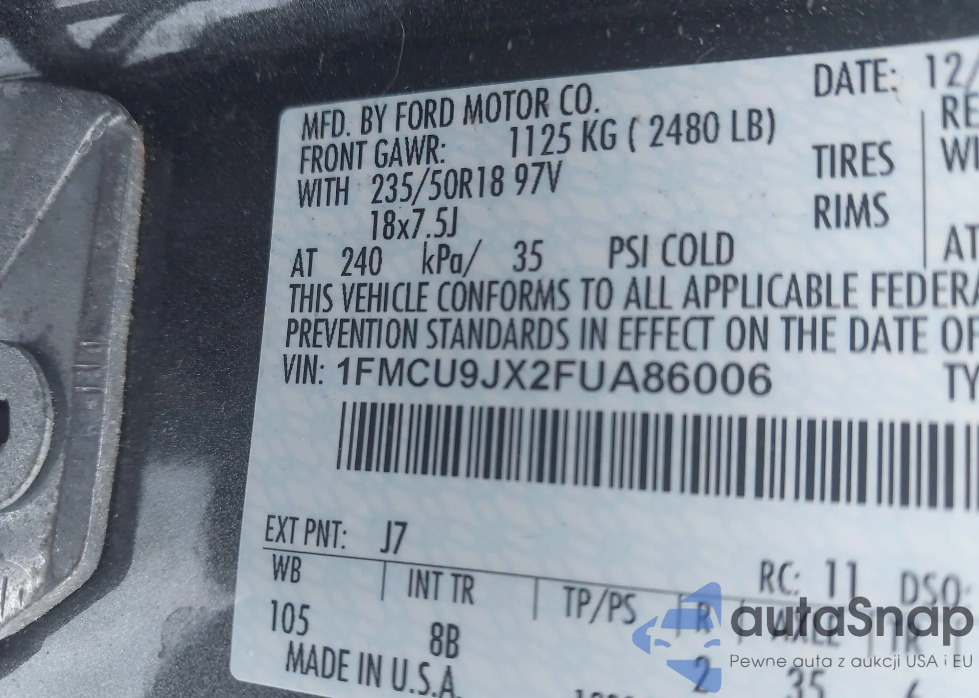 VIN: 1FMCU9JX2FUA86006