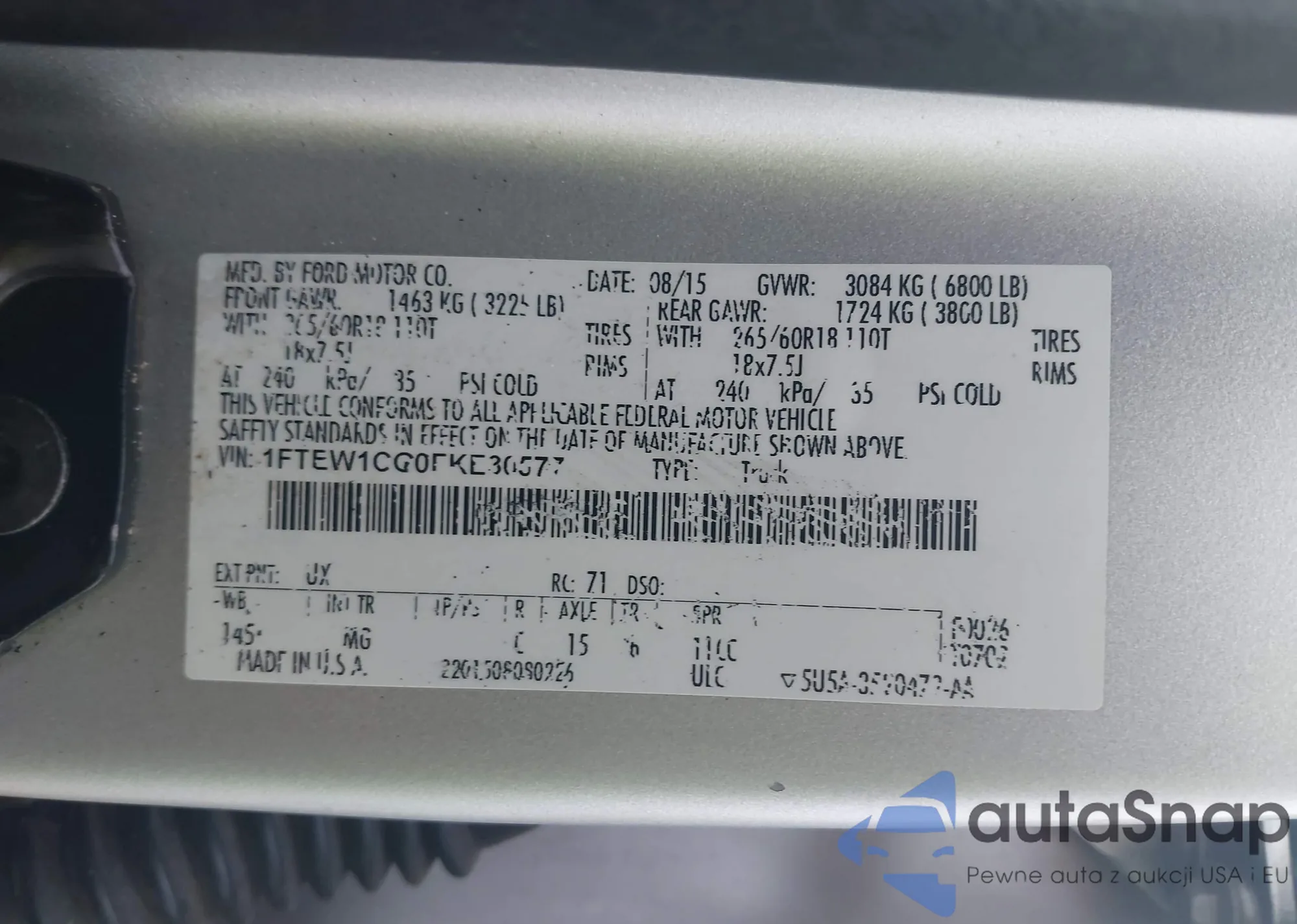 Автомобиль Ford F-150 2015 (VIN 1FTEW1CG0FKE30577) ранее не участвовал в торгах. Документы чистые, пробег соответствует или ниже среднего по рынку. Продаётся страховой компанией — рекомендуем покупку. Доставка в порт займет около 6–8 недель.