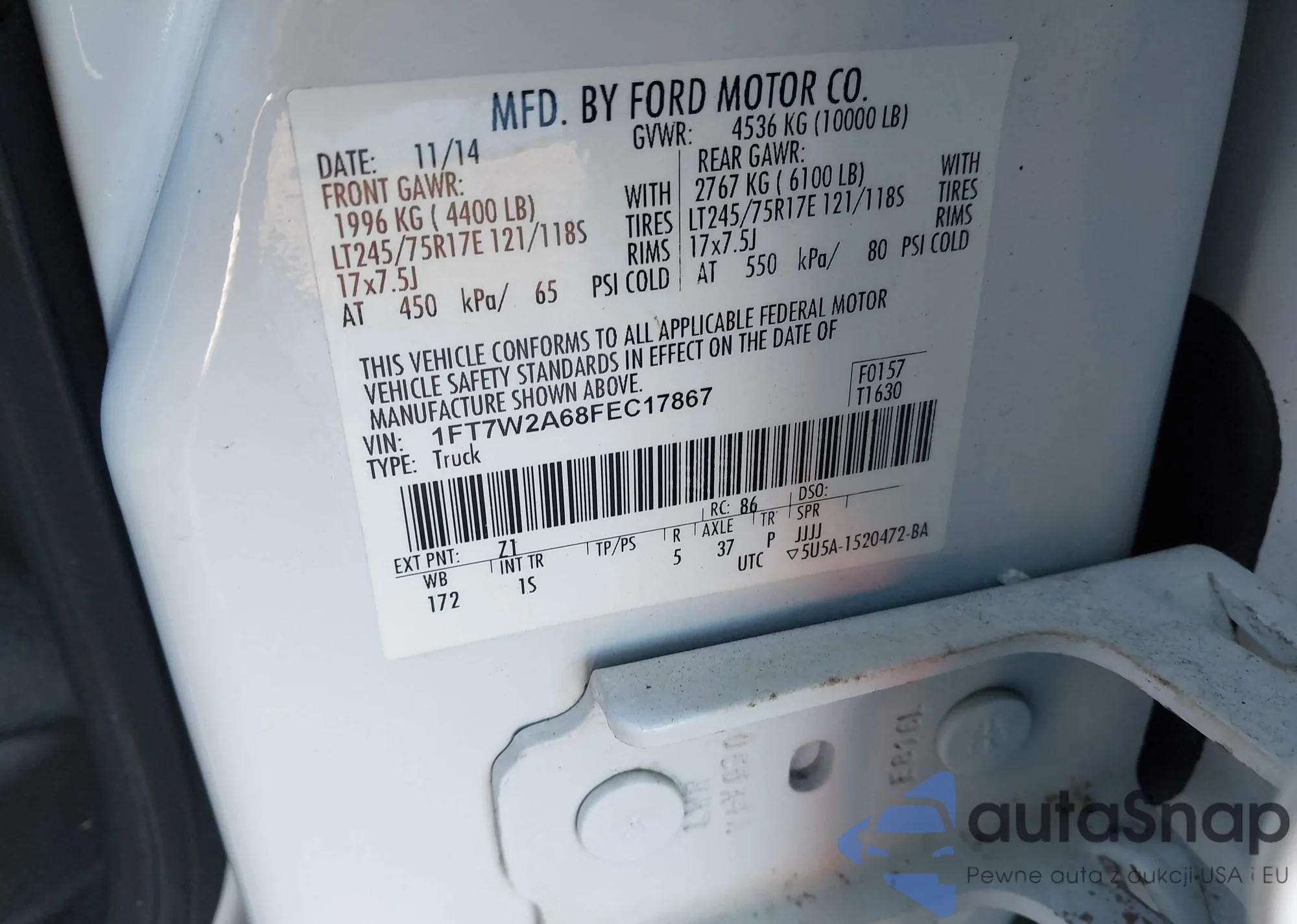 Автомобиль Ford F250 2015 (VIN 1FT7W2A68FEC17867) ранее не участвовал в торгах. Документы чистые, пробег соответствует или ниже среднего по рынку. Продаётся страховой компанией — рекомендуем покупку. Доставка в порт займет около 6–8 недель.