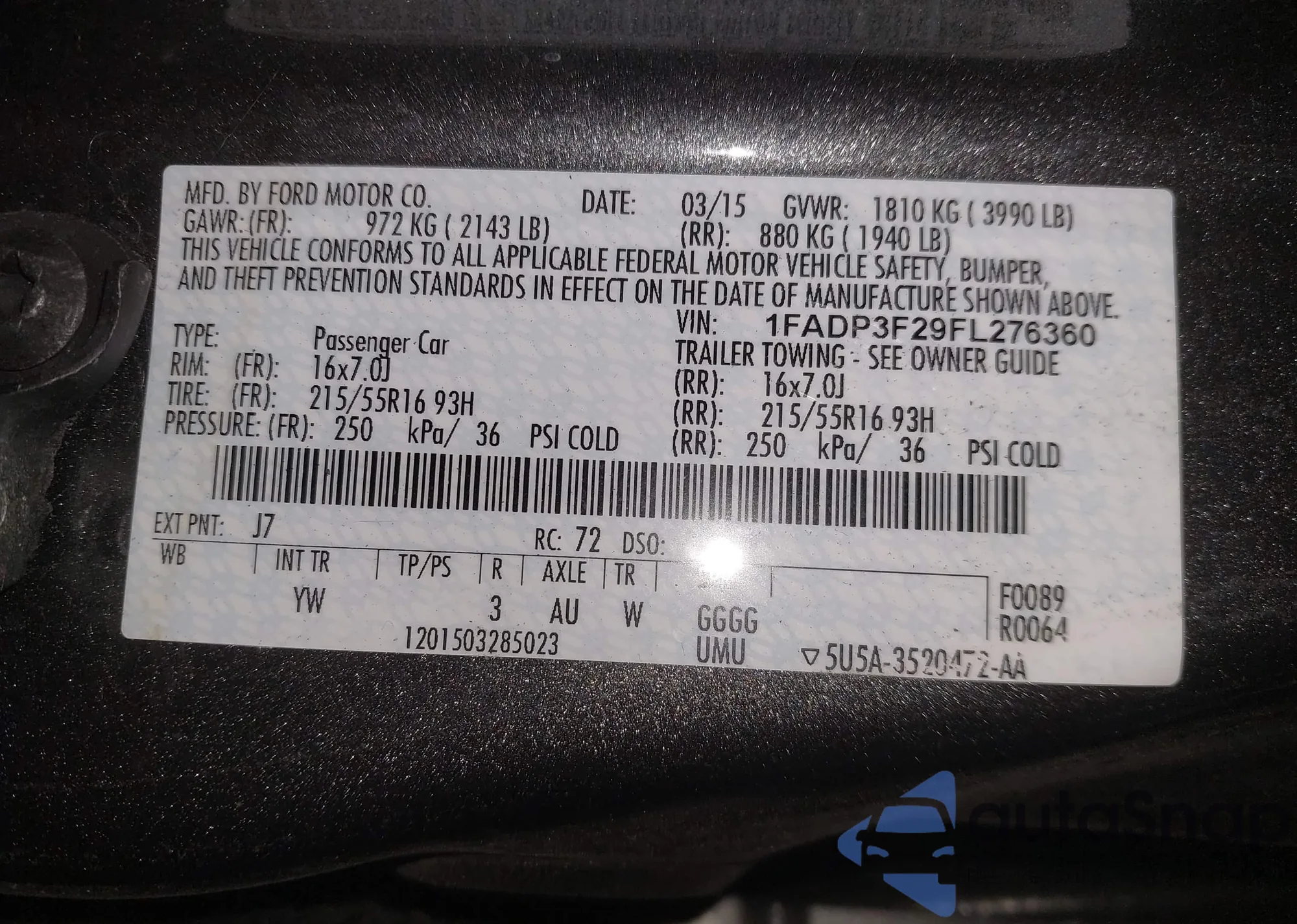 VIN: 1FADP3F29FL276360