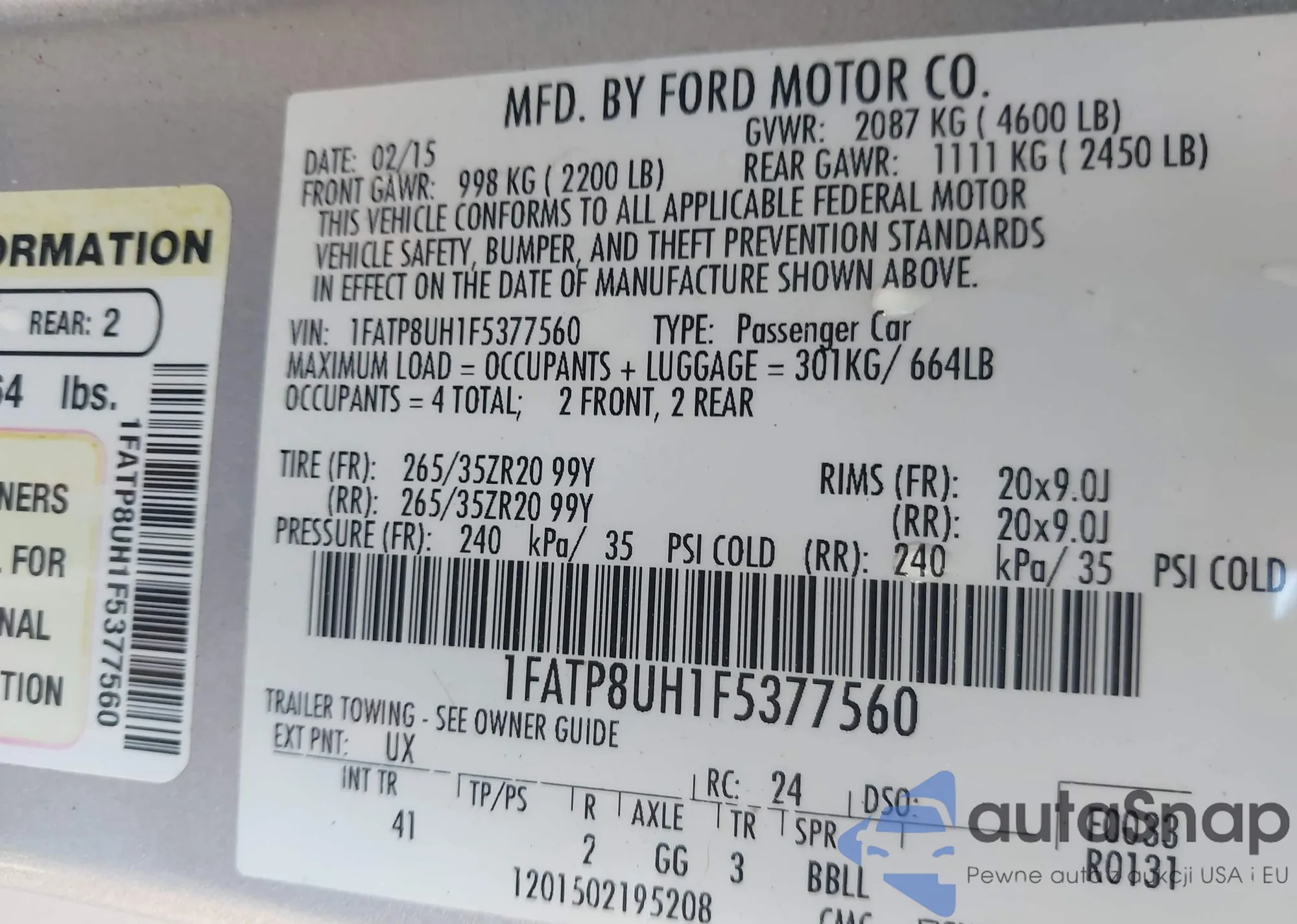 Автомобиль Ford Mustang 2015 (VIN 1FATP8UH1F5377560) ранее не участвовал в торгах. Документы чистые, пробег соответствует или ниже среднего по рынку. Продаётся страховой компанией — рекомендуем покупку. Доставка в порт займет около 6–8 недель.