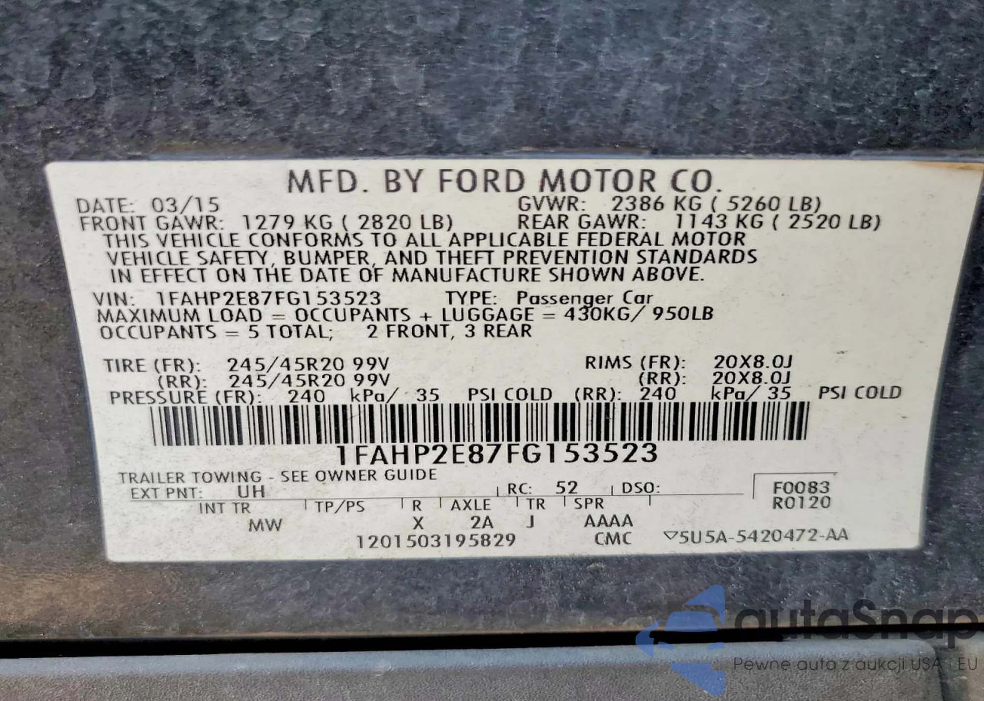Автомобиль Ford Taurus 2015 (VIN 1FAHP2E87FG153523) ранее не участвовал в торгах. Документы чистые, пробег соответствует или ниже среднего по рынку. Продаётся страховой компанией — рекомендуем покупку. Доставка в порт займет около 6–8 недель.