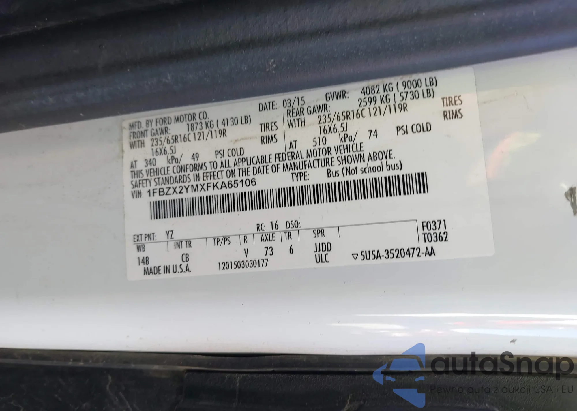 Автомобиль Ford Transit 2015 (VIN 1FBZX2YMXFKA65106) ранее не участвовал в торгах. Документы чистые, пробег соответствует или ниже среднего по рынку. Продаётся страховой компанией — рекомендуем покупку. Доставка в порт займет около 6–8 недель.