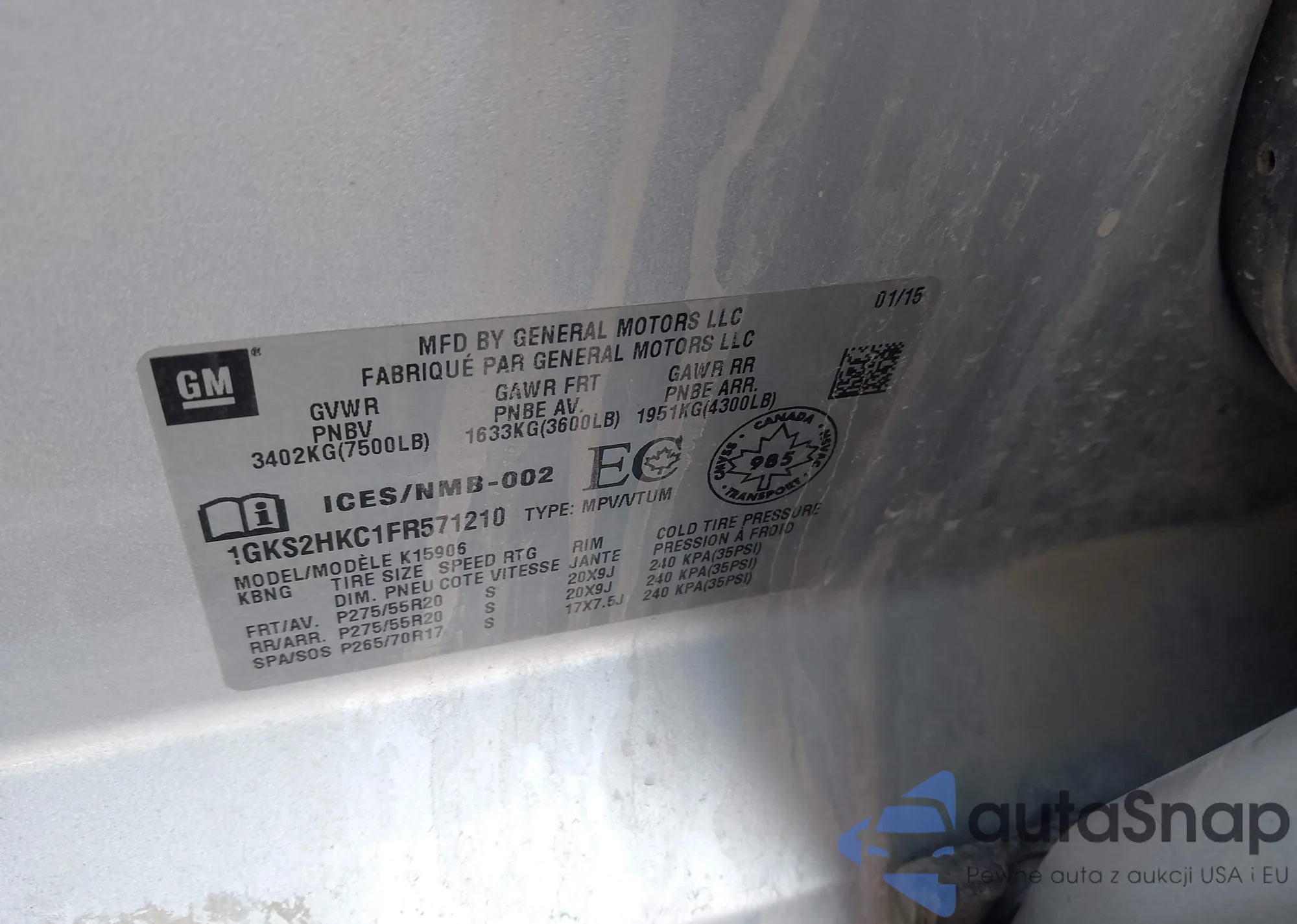 • VIN: 1GKS2HKC1FR571210