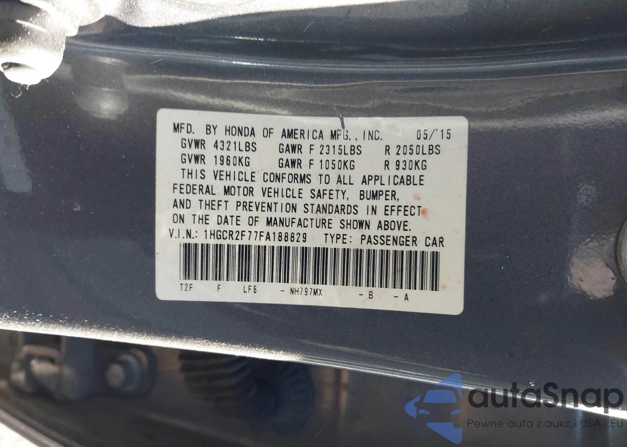 Автомобиль Honda Accord 2015 (VIN 1HGCR2F77FA188829) ранее не участвовал в торгах. Документы чистые, пробег соответствует или ниже среднего по рынку. Продаётся страховой компанией — рекомендуем покупку. Доставка в порт займет около 6–8 недель.