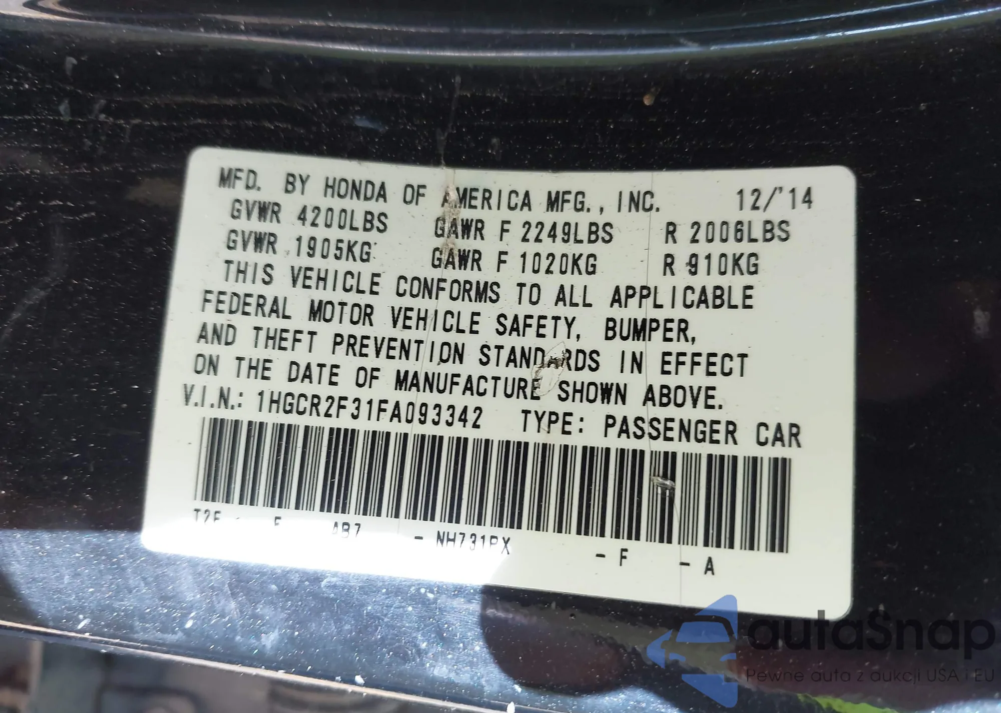 VIN: 1HGCR2F31FA093342