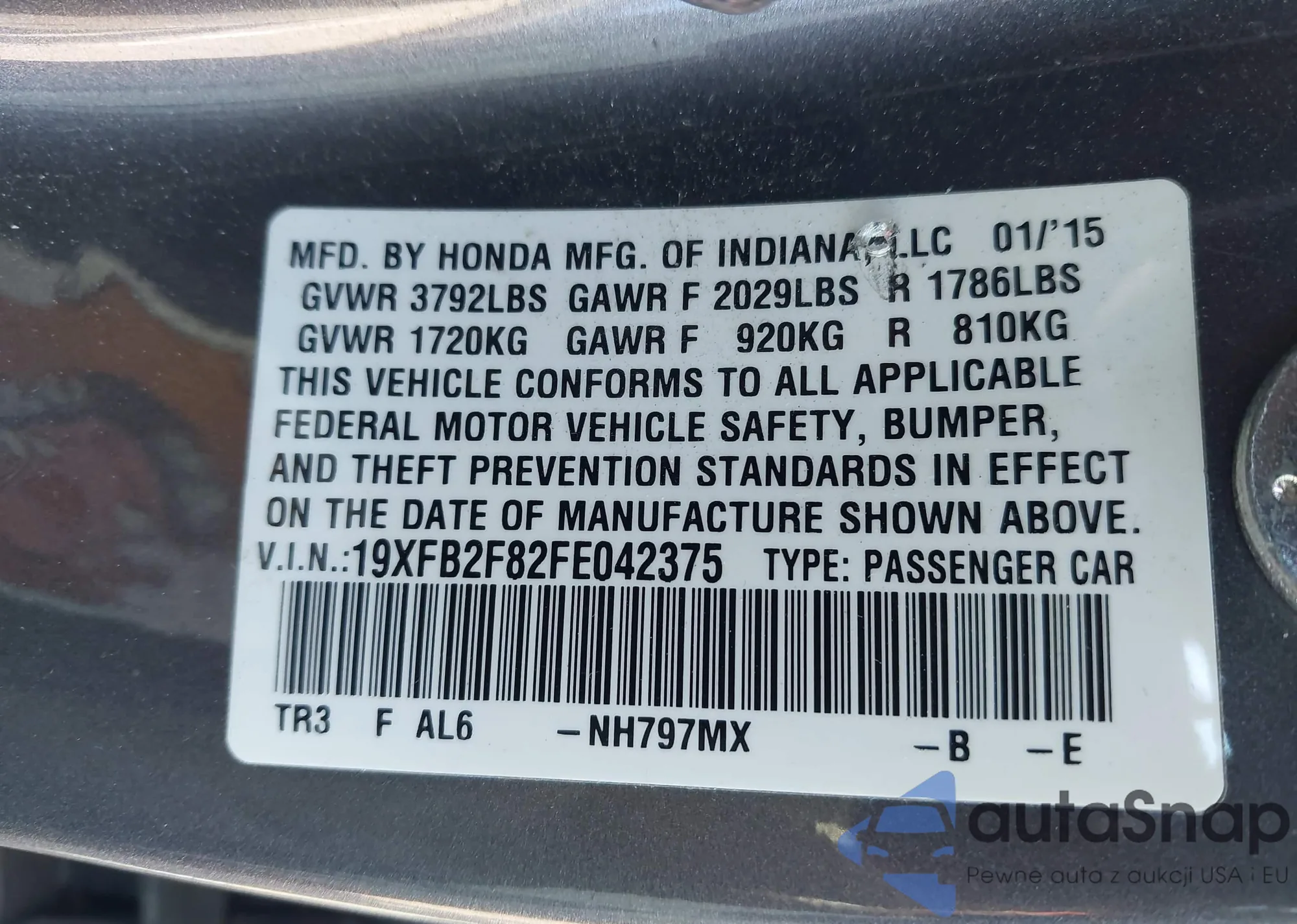 Автомобиль Honda Civic 2015 (VIN 19XFB2F82FE042375) ранее не участвовал в торгах. Документы чистые, пробег соответствует или ниже среднего по рынку. Продаётся страховой компанией — рекомендуем покупку. Доставка в порт займет около 6–8 недель.