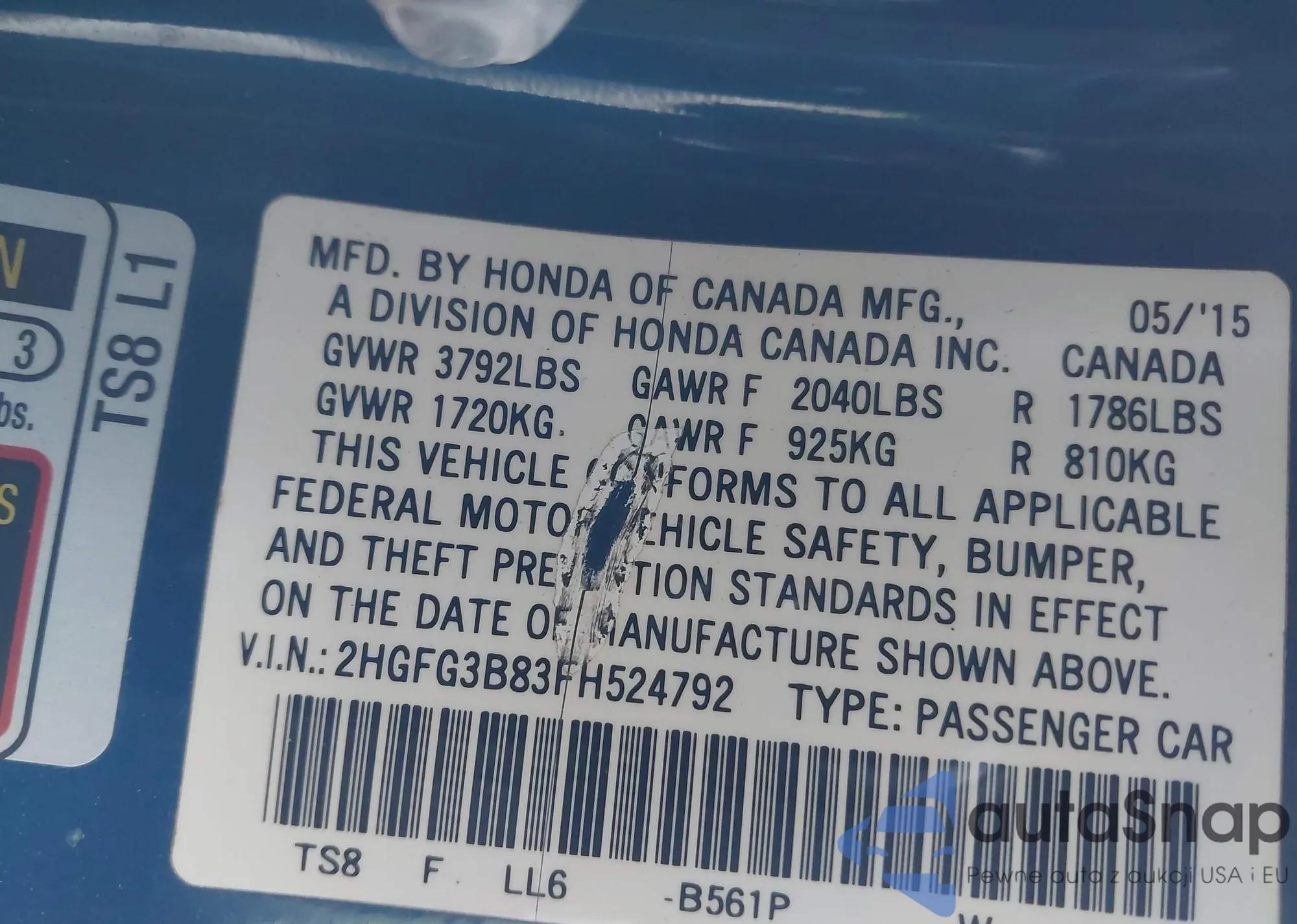 VIN: 2HGFG3B83FH524792