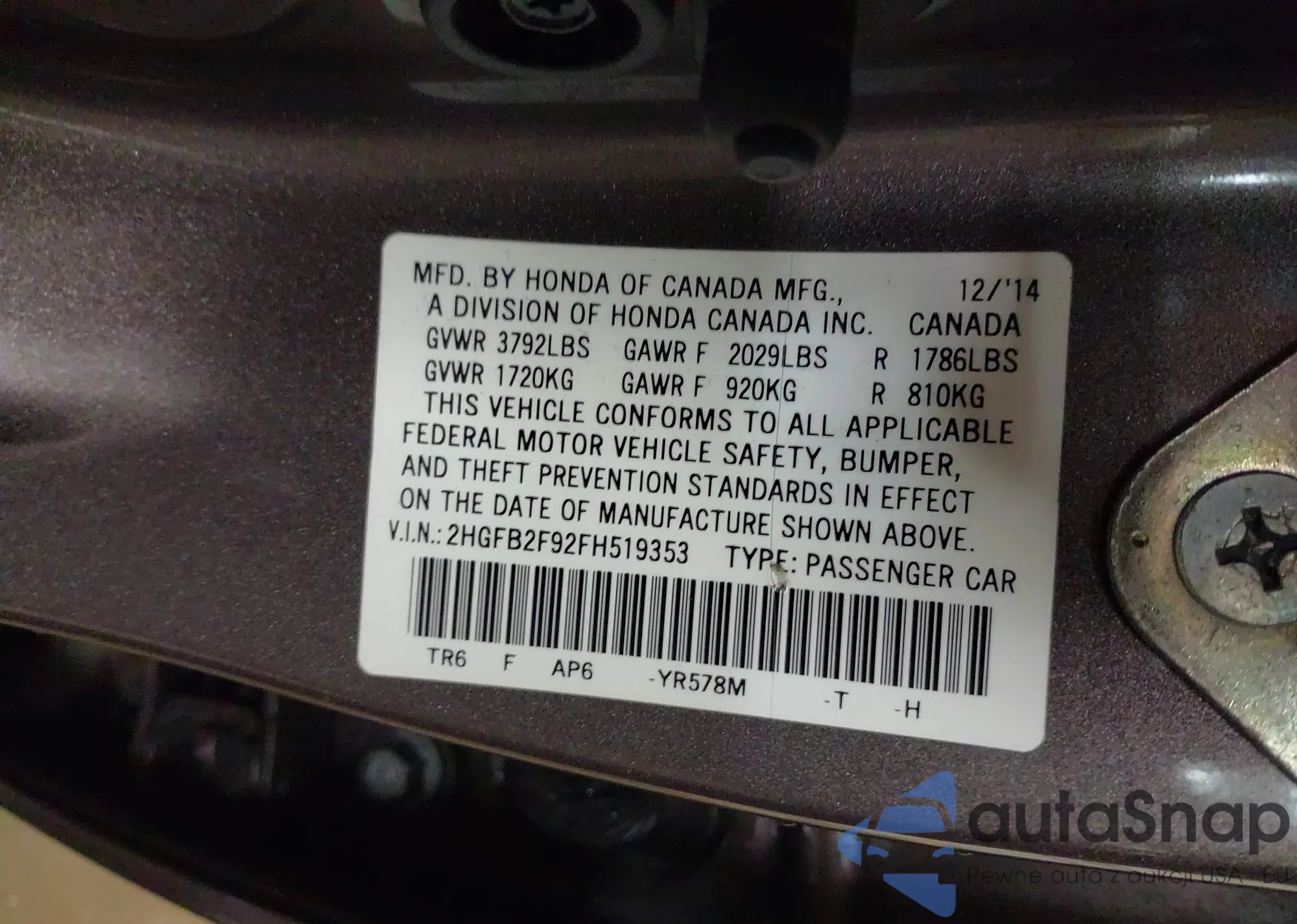 • VIN: 2HGFB2F92FH519353