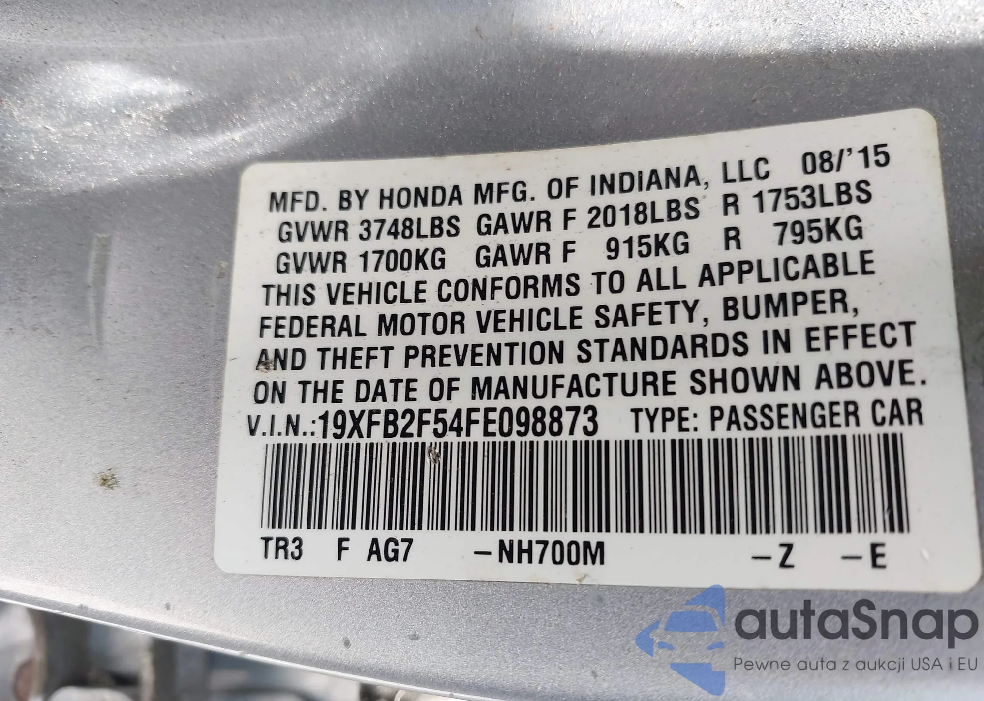 • VIN: 19XFB2F54FE098873