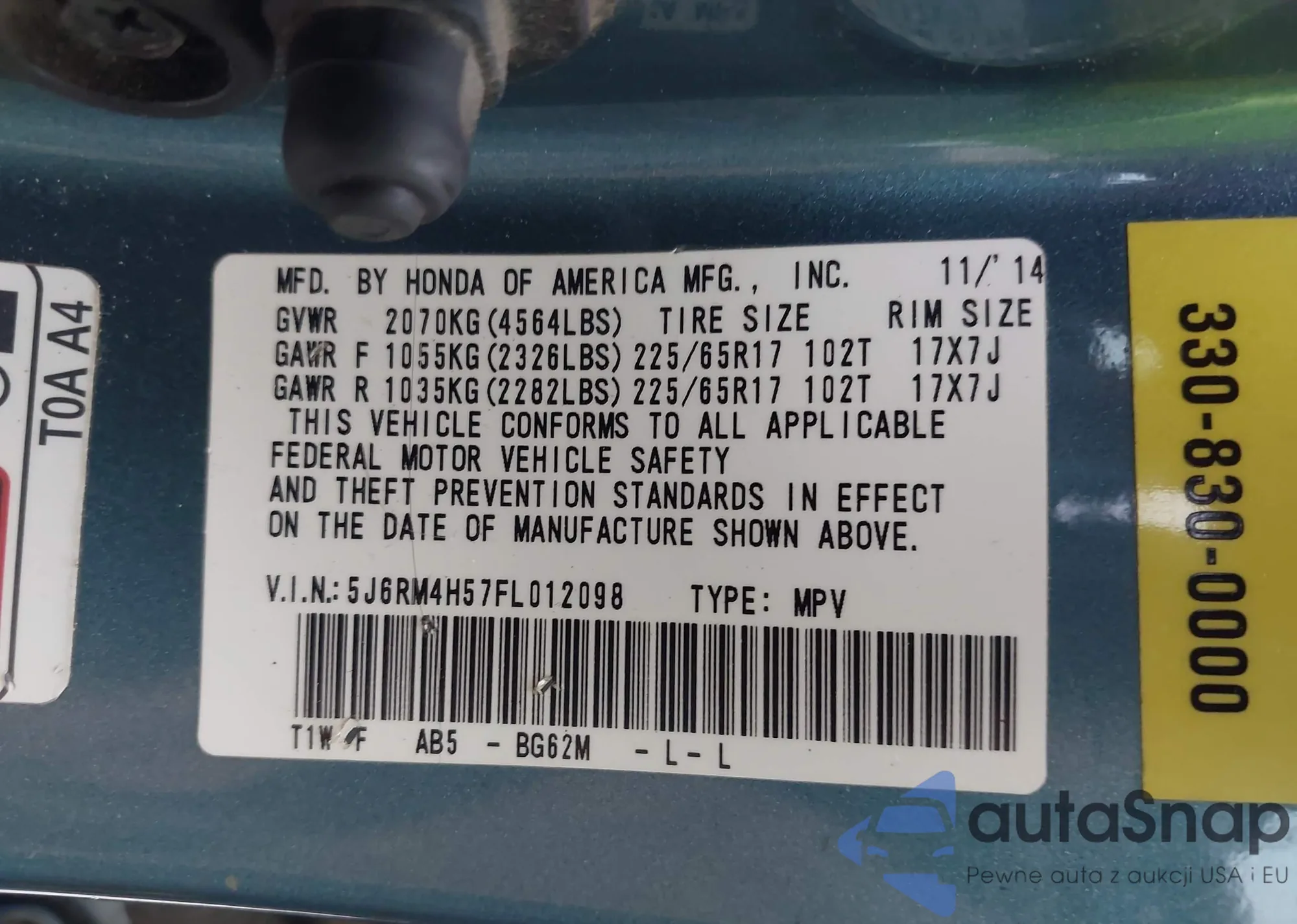 VIN: 5J6RM4H57FL012098