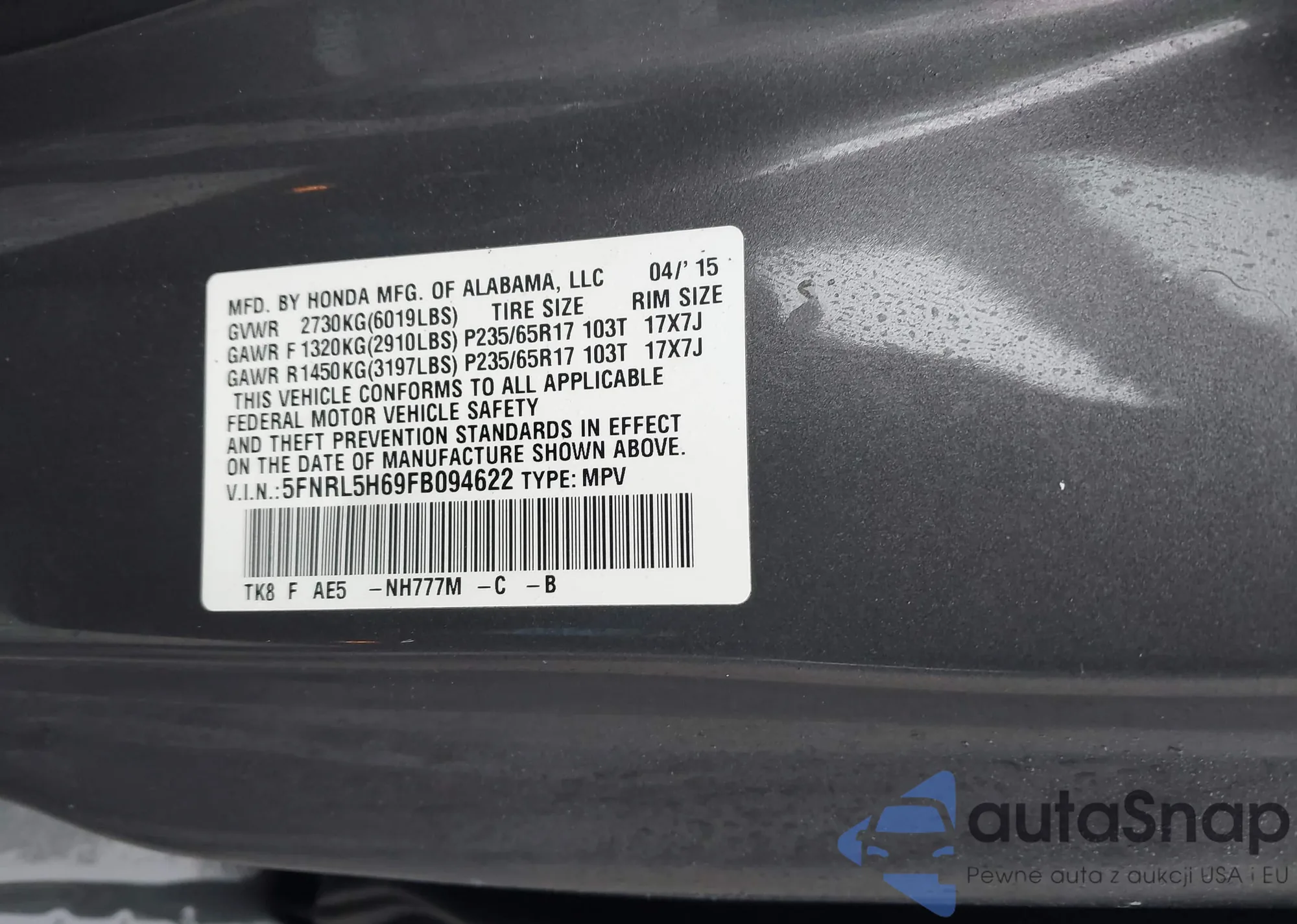 VIN: 5FNRL5H69FB094622