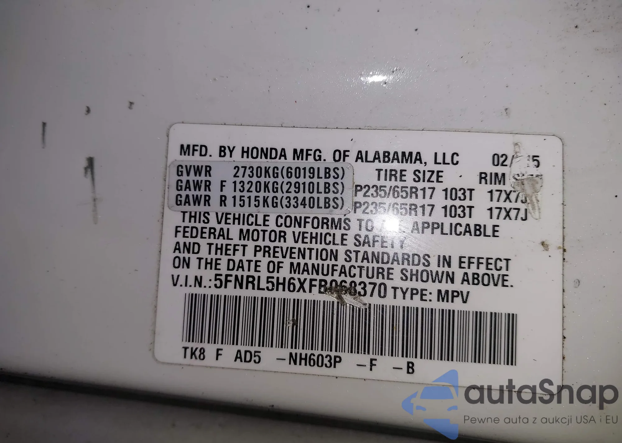 • VIN: 5FNRL5H6XFB068370