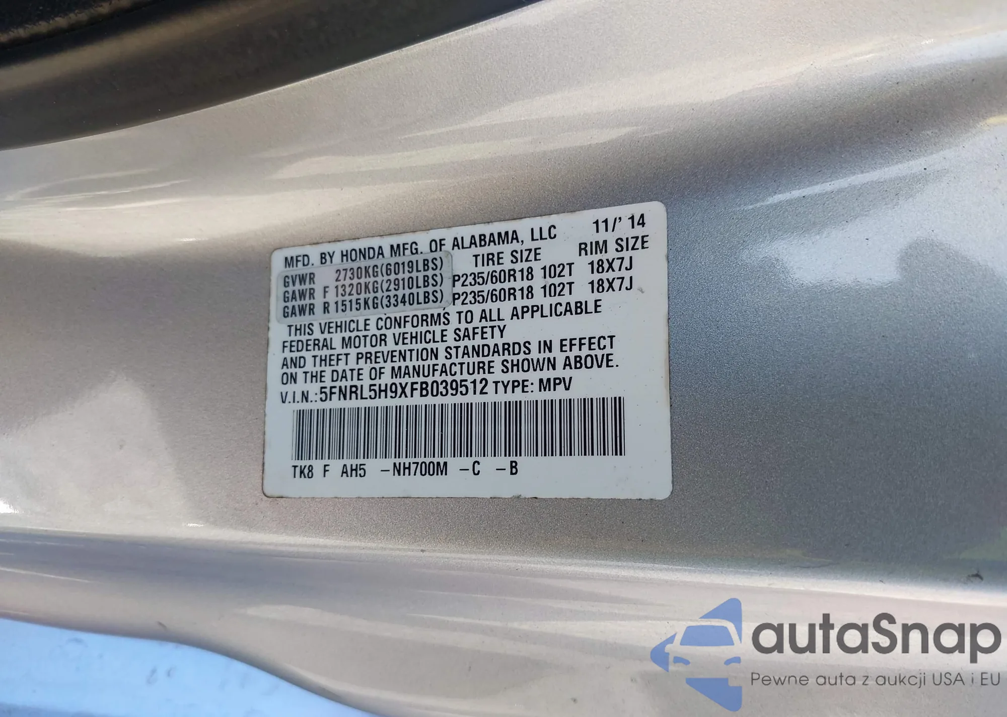 VIN: 5FNRL5H9XFB039512