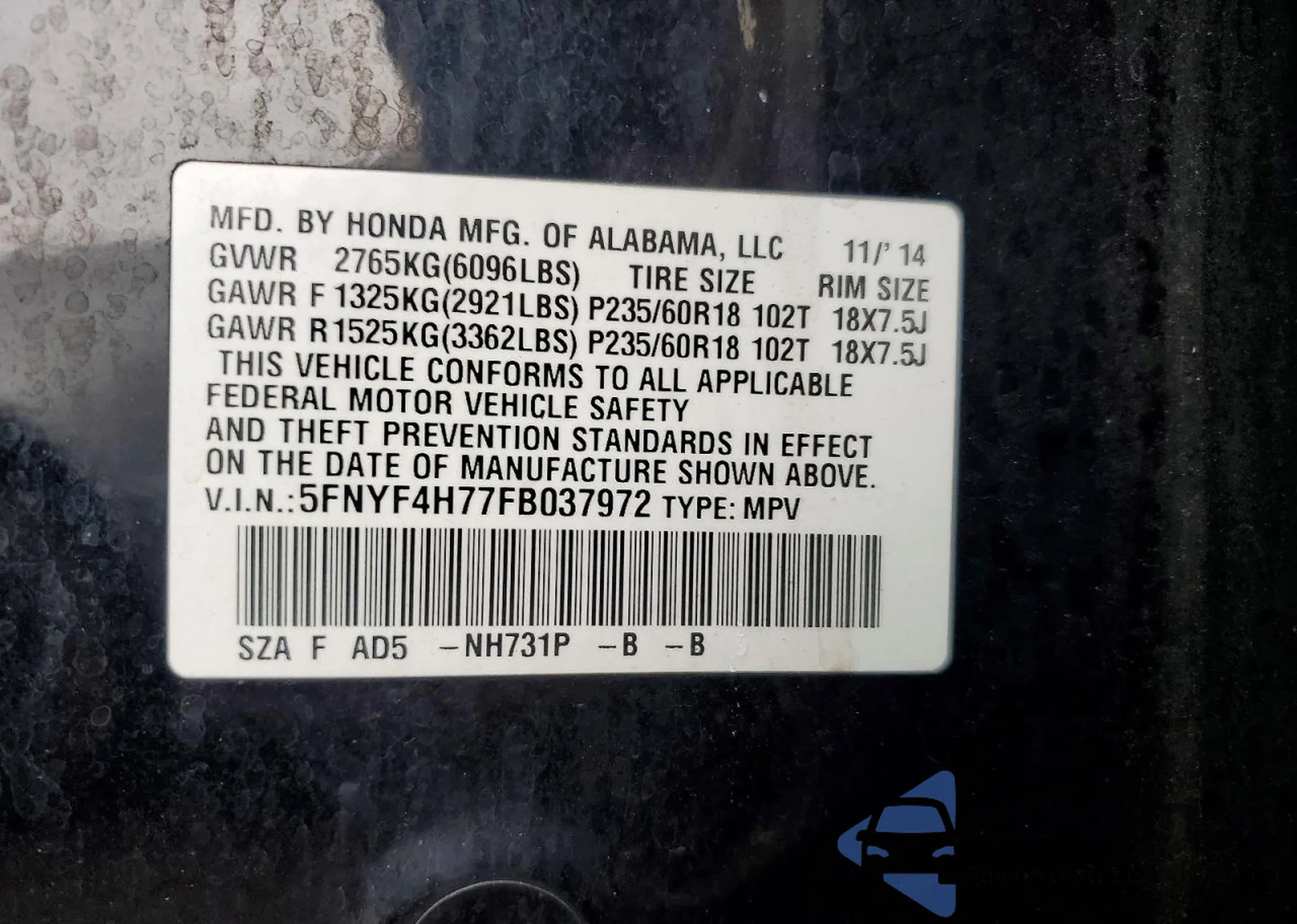VIN: 5FNYF4H77FB037972