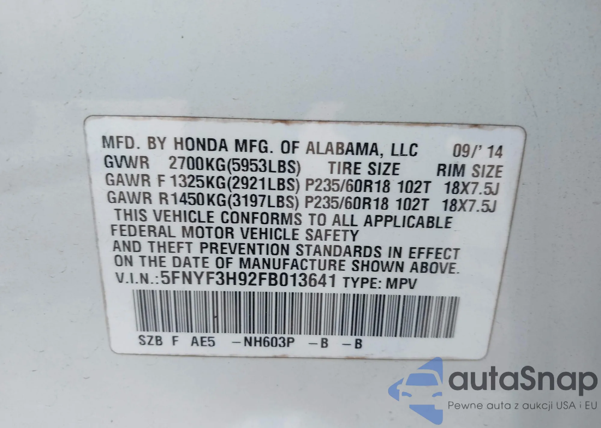 VIN: 5FNYF3H92FB013641