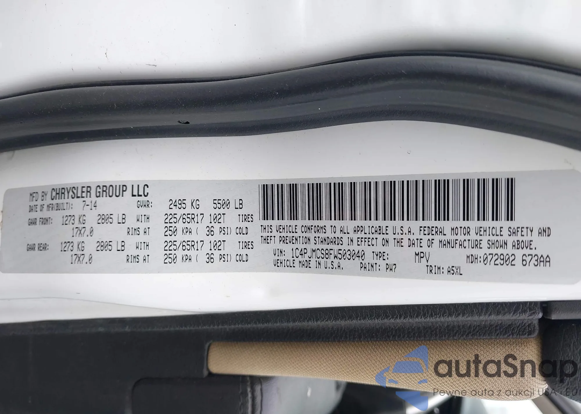 Автомобиль Jeep Cherokee 2015 (VIN 1C4PJMCS8FW503040) ранее не участвовал в торгах. Документы чистые, пробег соответствует или ниже среднего по рынку. Продаётся страховой компанией — рекомендуем покупку. Доставка в порт займет около 6–8 недель.